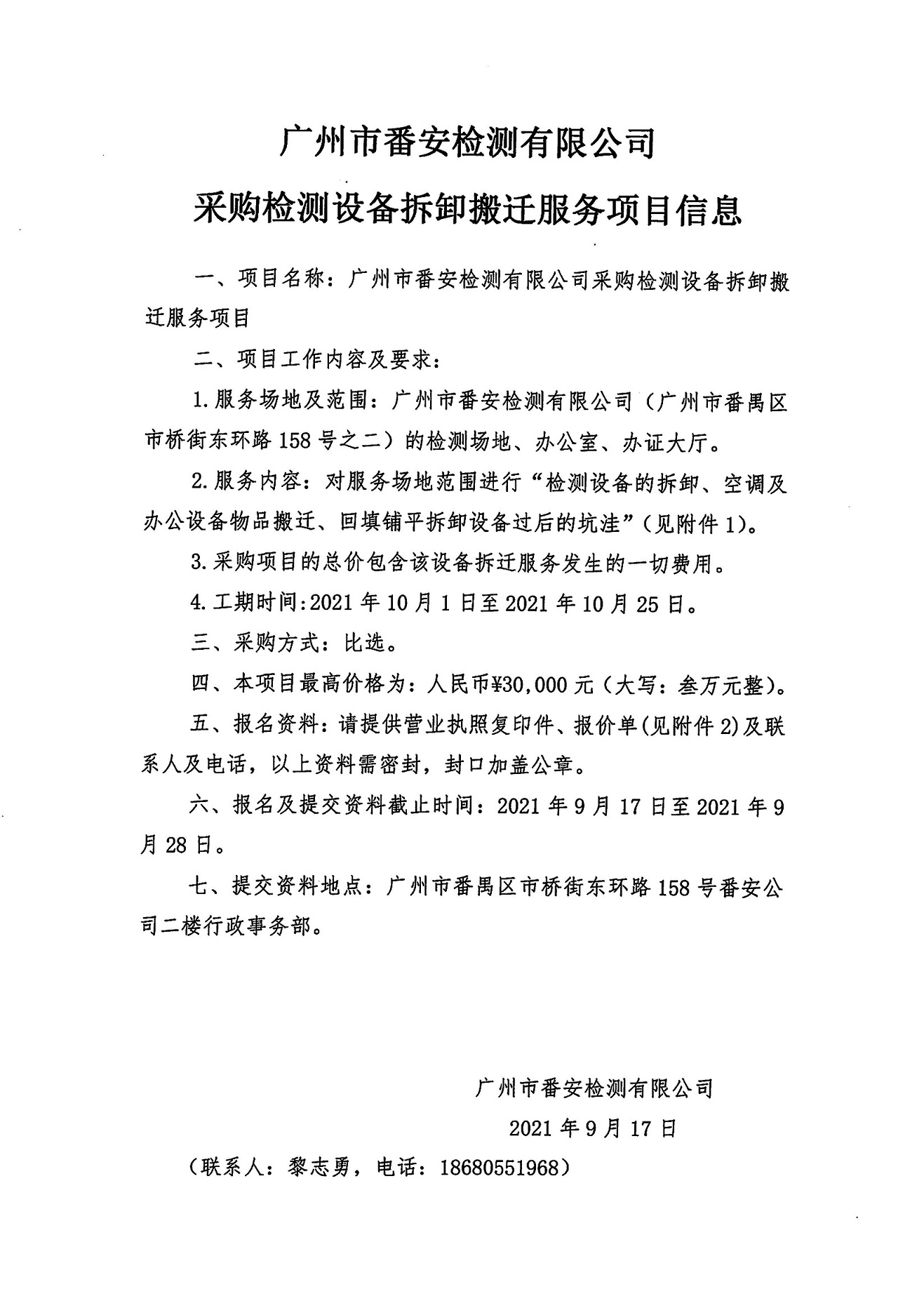 广州市番安检测有限公司采购检测设备拆卸搬迁服务项目信息