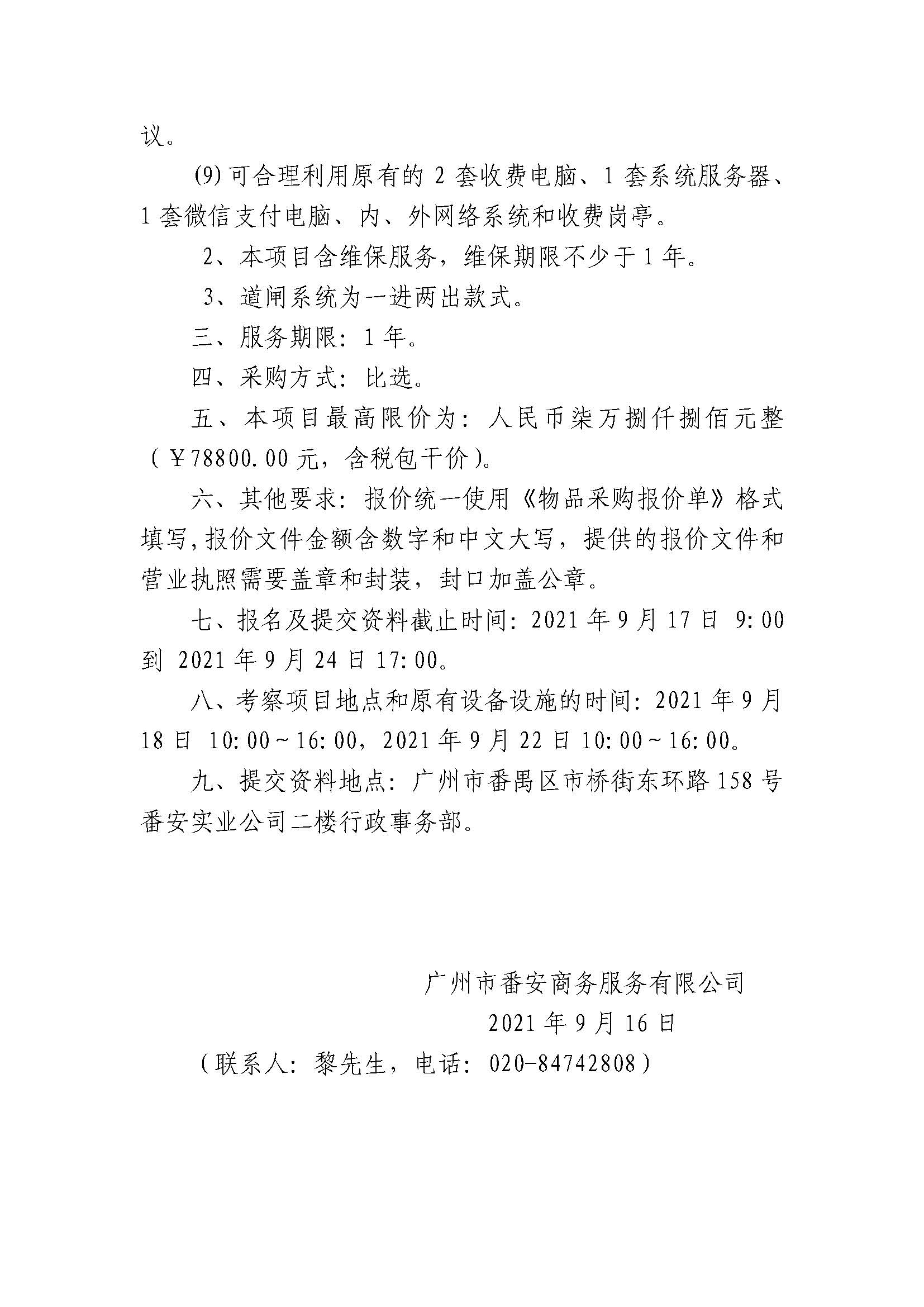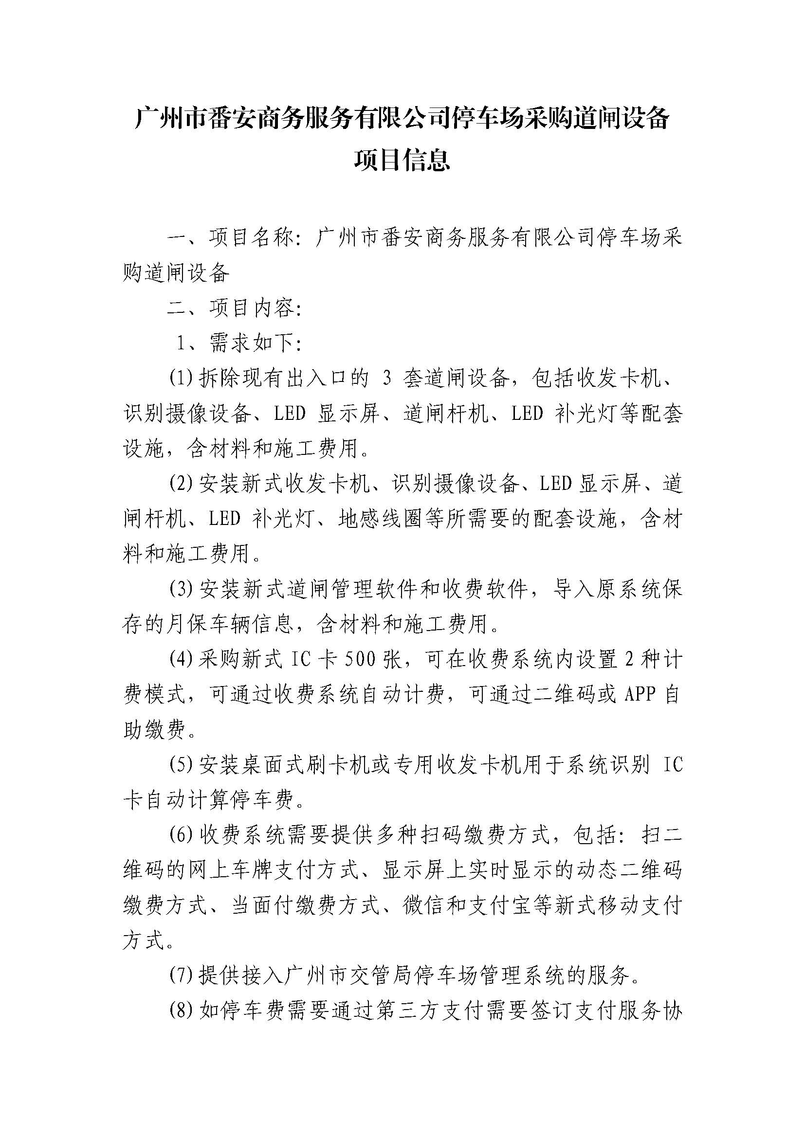 广州市番安商务服务有限公司停车场采购道闸设备项目信息