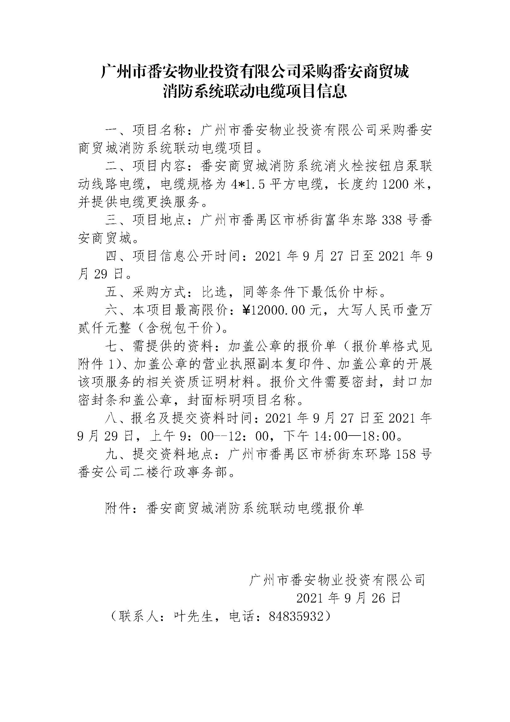 广州市番安物业投资有限公司采购番安商贸城消防系统联动电缆项目信息