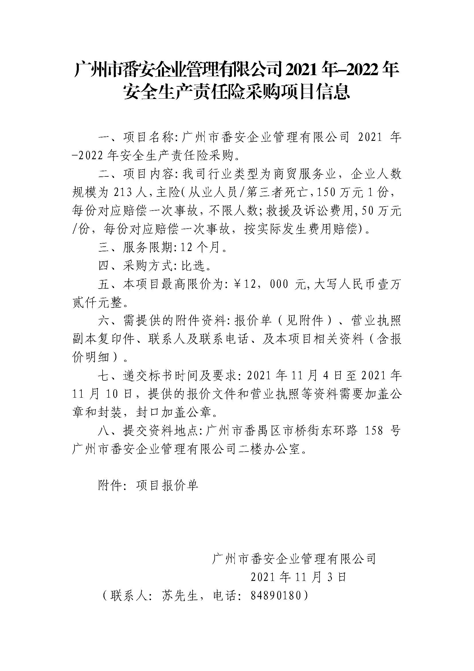 广州市番安企业管理有限公司2021年-2022年安全生产责任险采购项目信息