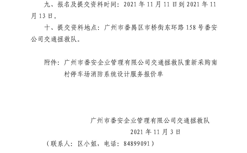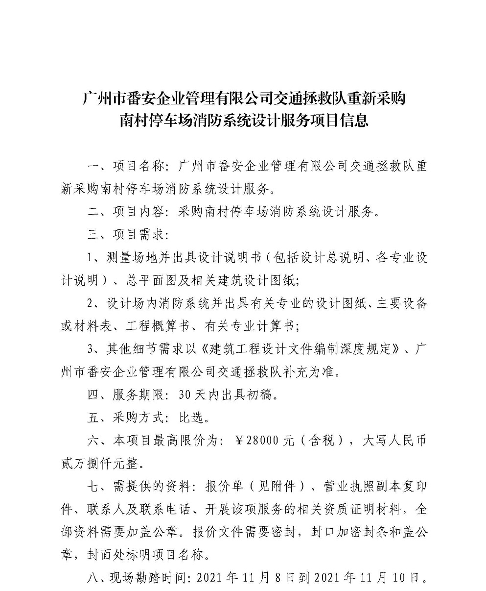 广州市番安企业管理有限公司交通拯救队重新采购南村停车场消防系统设计服务项目信息(重新发布)