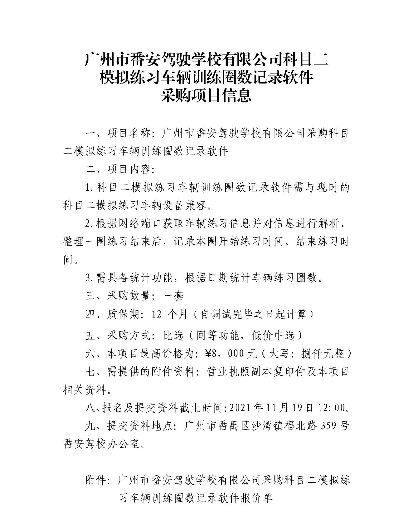 广州市番安驾驶学校有限公司科目二模拟练习车辆训练圈数记录软件采购项目信息