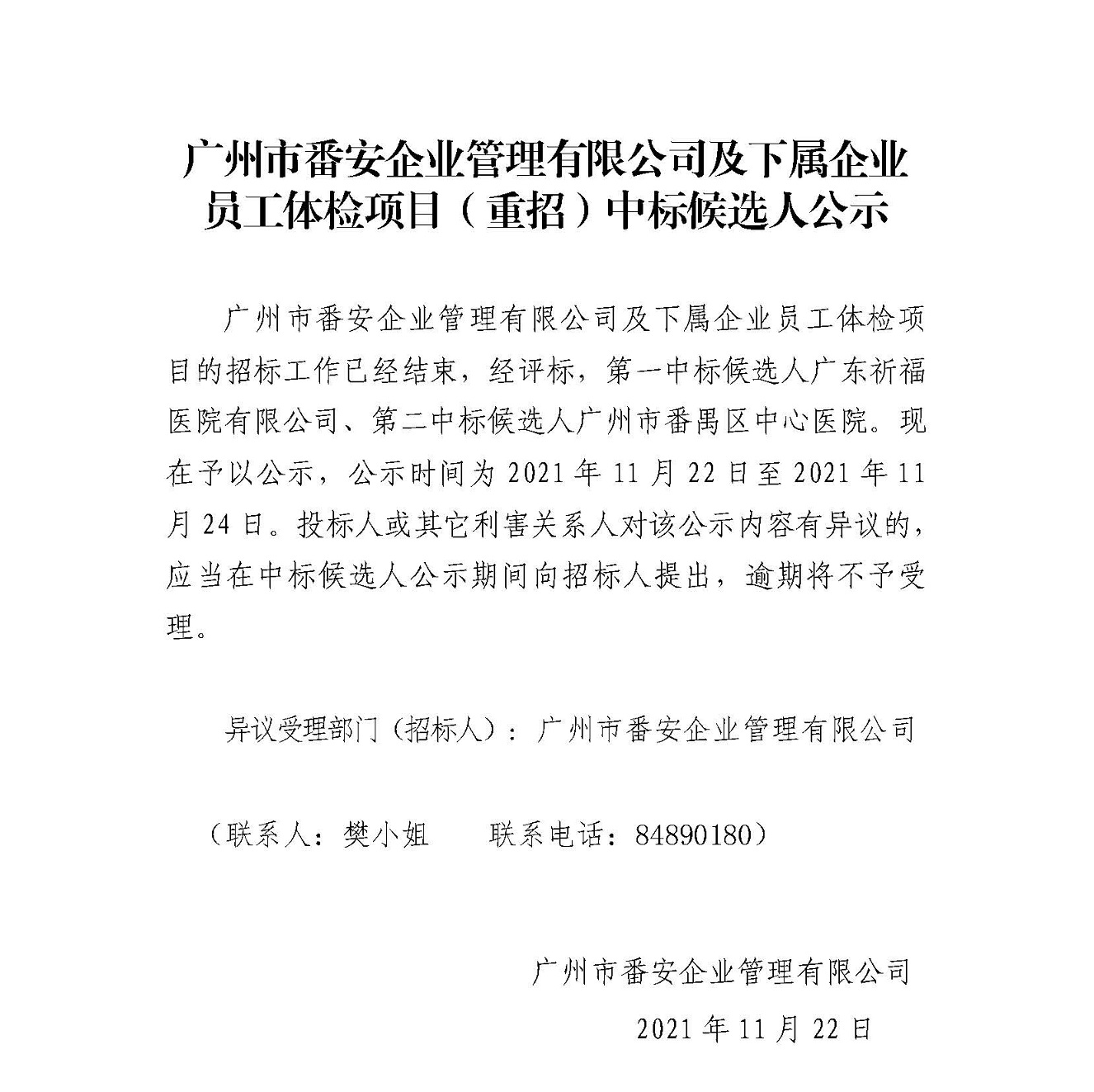 广州市番安企业管理有限公司及下属企业员工体检项目(重招)中标候选人公示