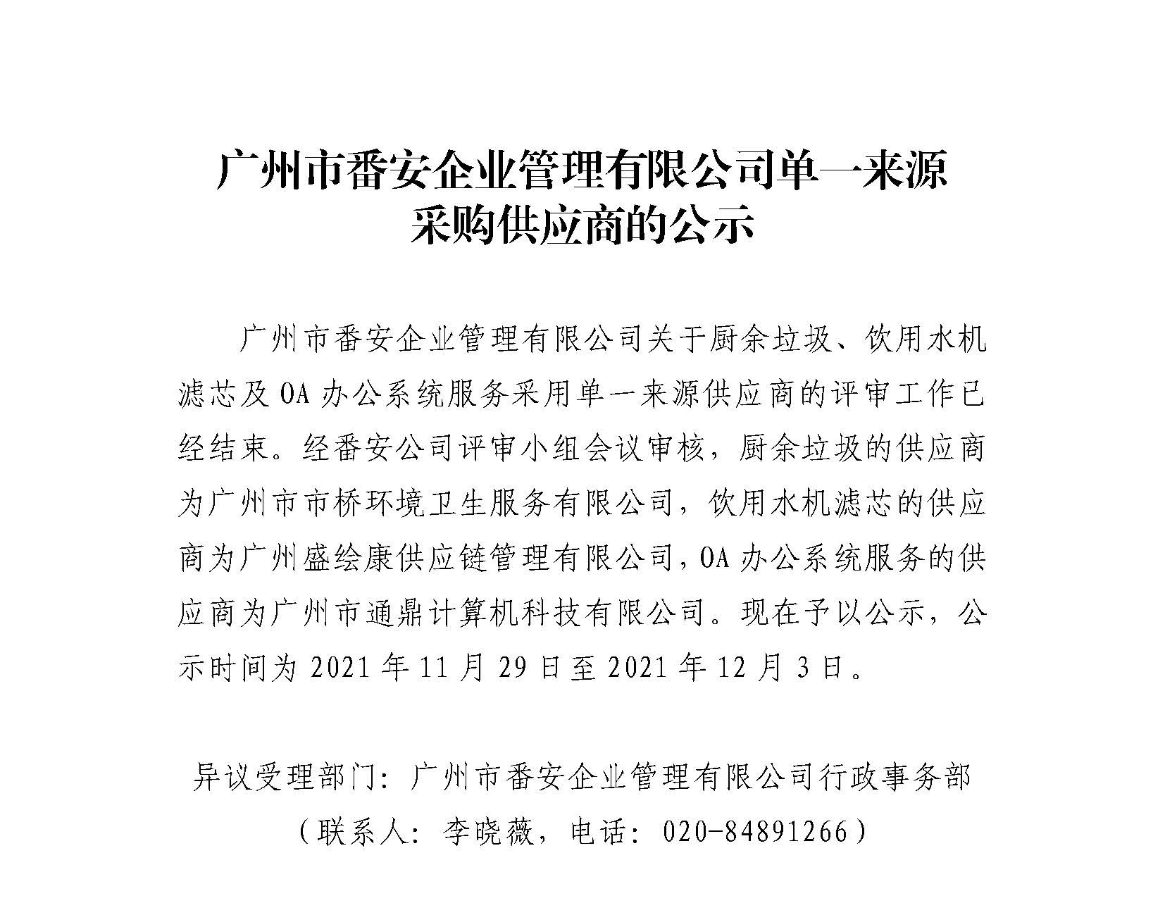 广州市番安企业管理有限公司单一来源采购供应商的公示