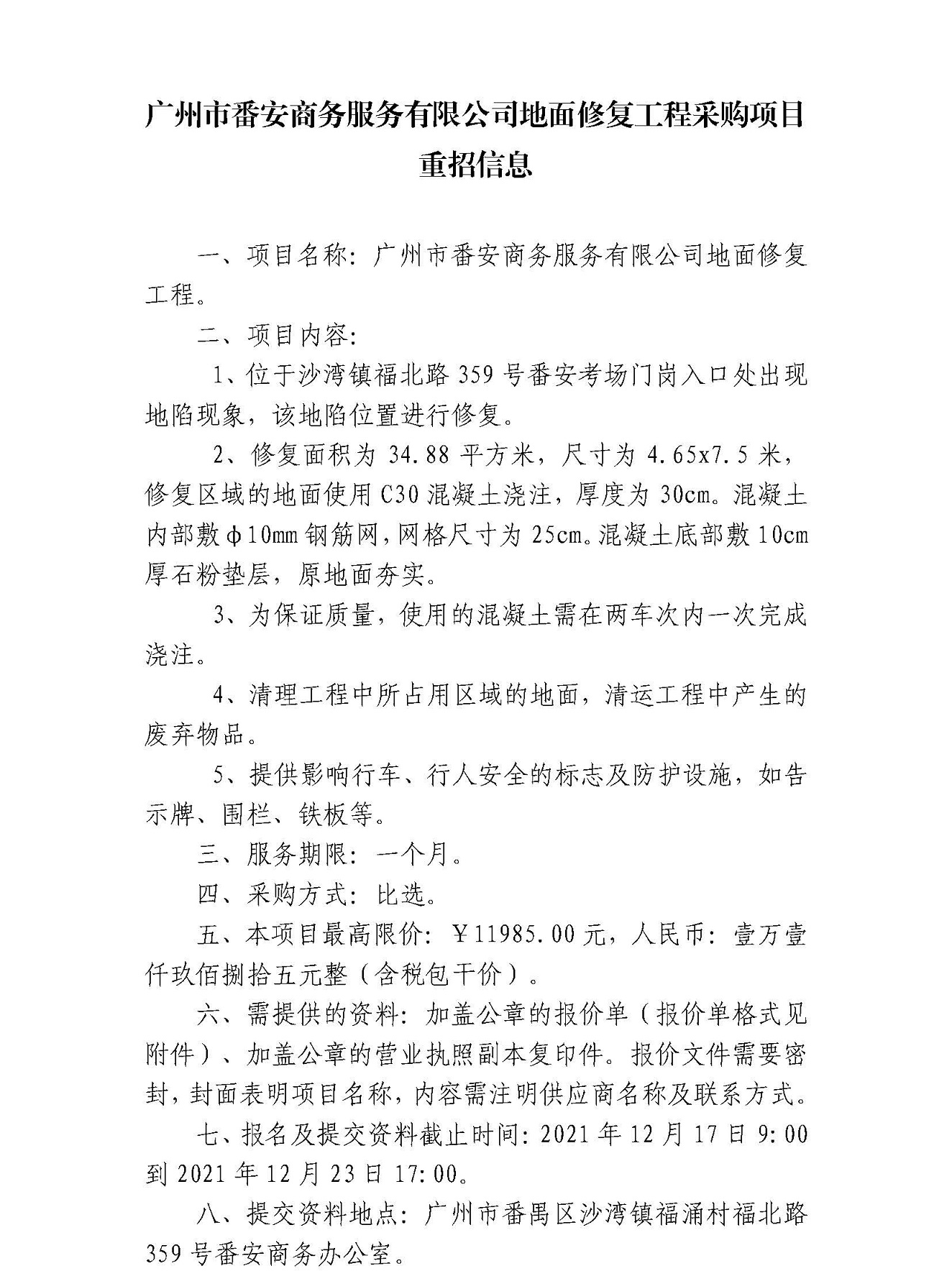 广州市番安商务服务有限公司地面修复工程采购项目重招信息