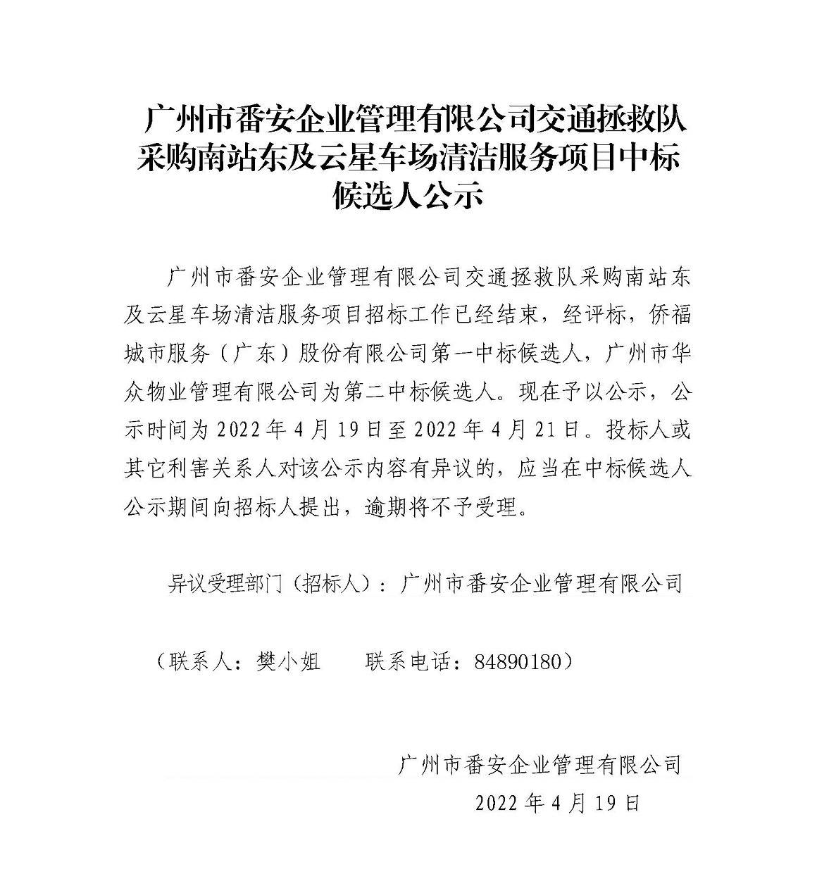 广州市番安企业管理有限公司交通拯救队采购南站东及云星车场清洁服务项目中标候选人公示