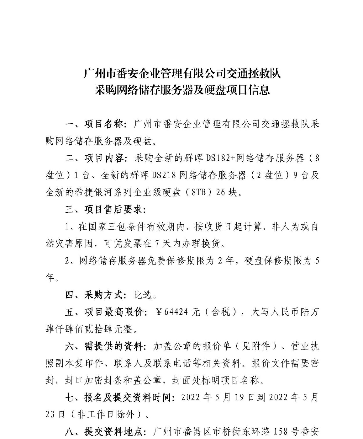 广州市番安企业管理有限公司交通拯救队采购网络储存服务器及硬盘项目信息
