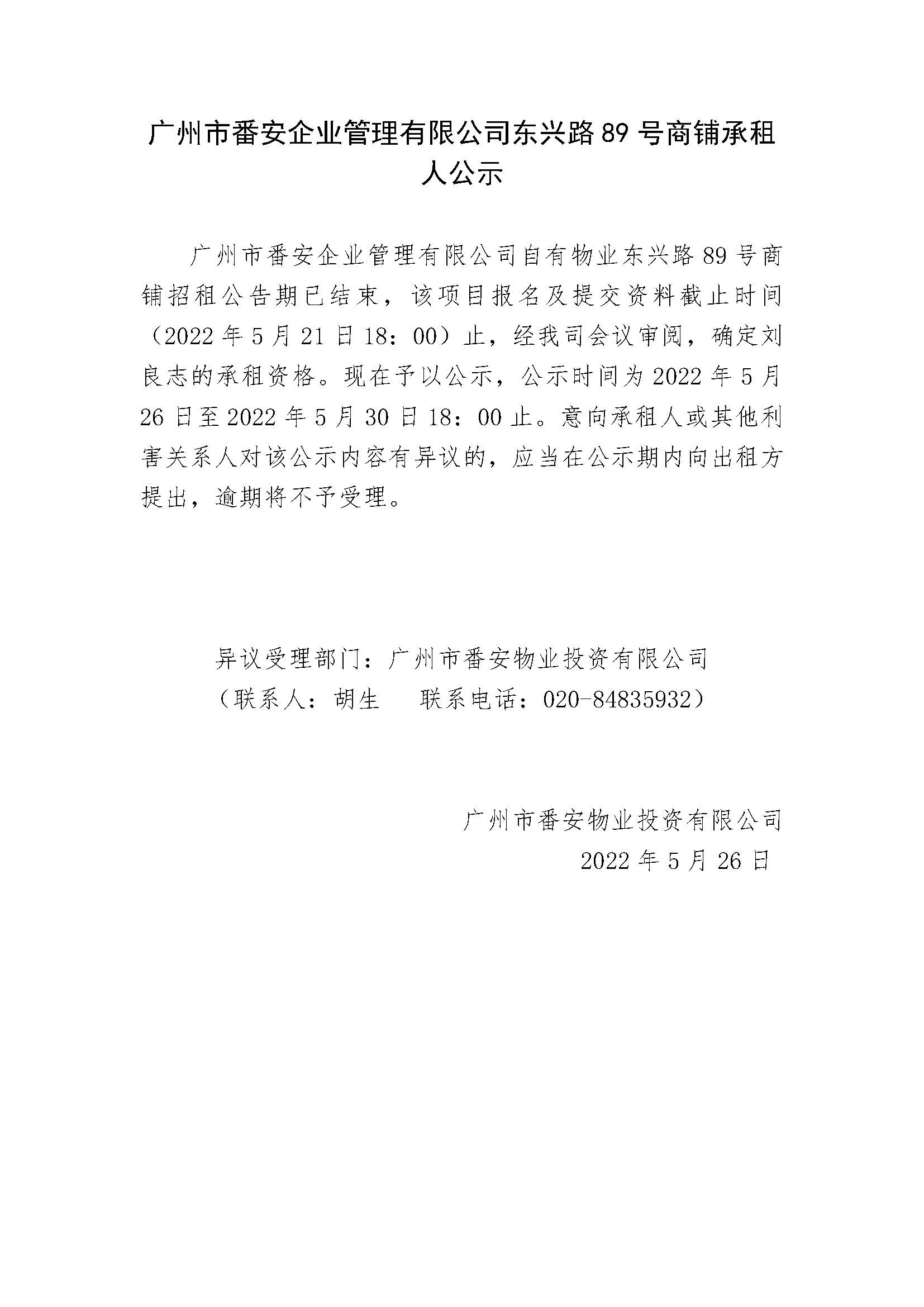 广州市番安企业管理有限公司东兴路89号商铺承租人公示