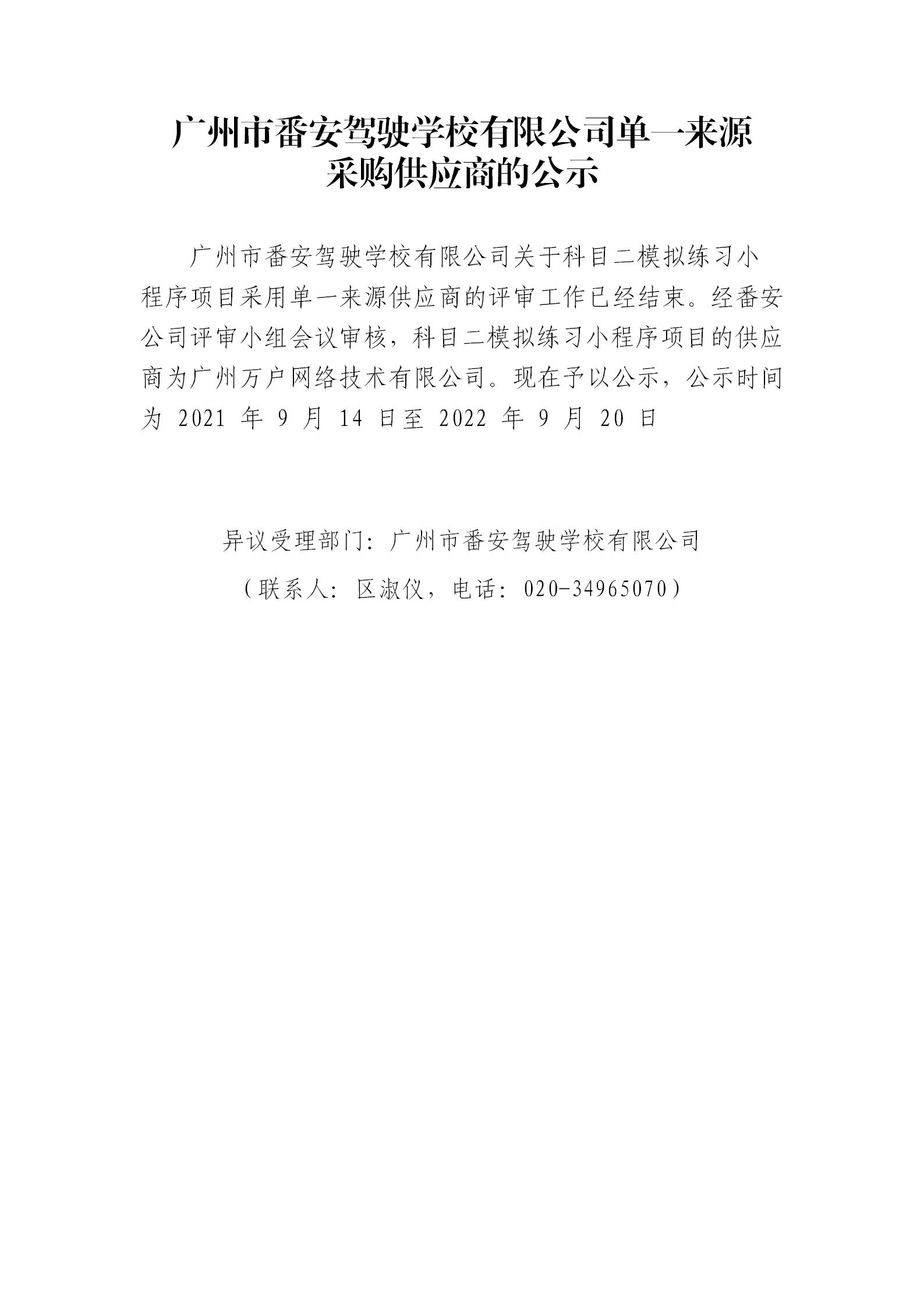 广州市番安驾驶学校有限公司单一来源采购供应商的公示