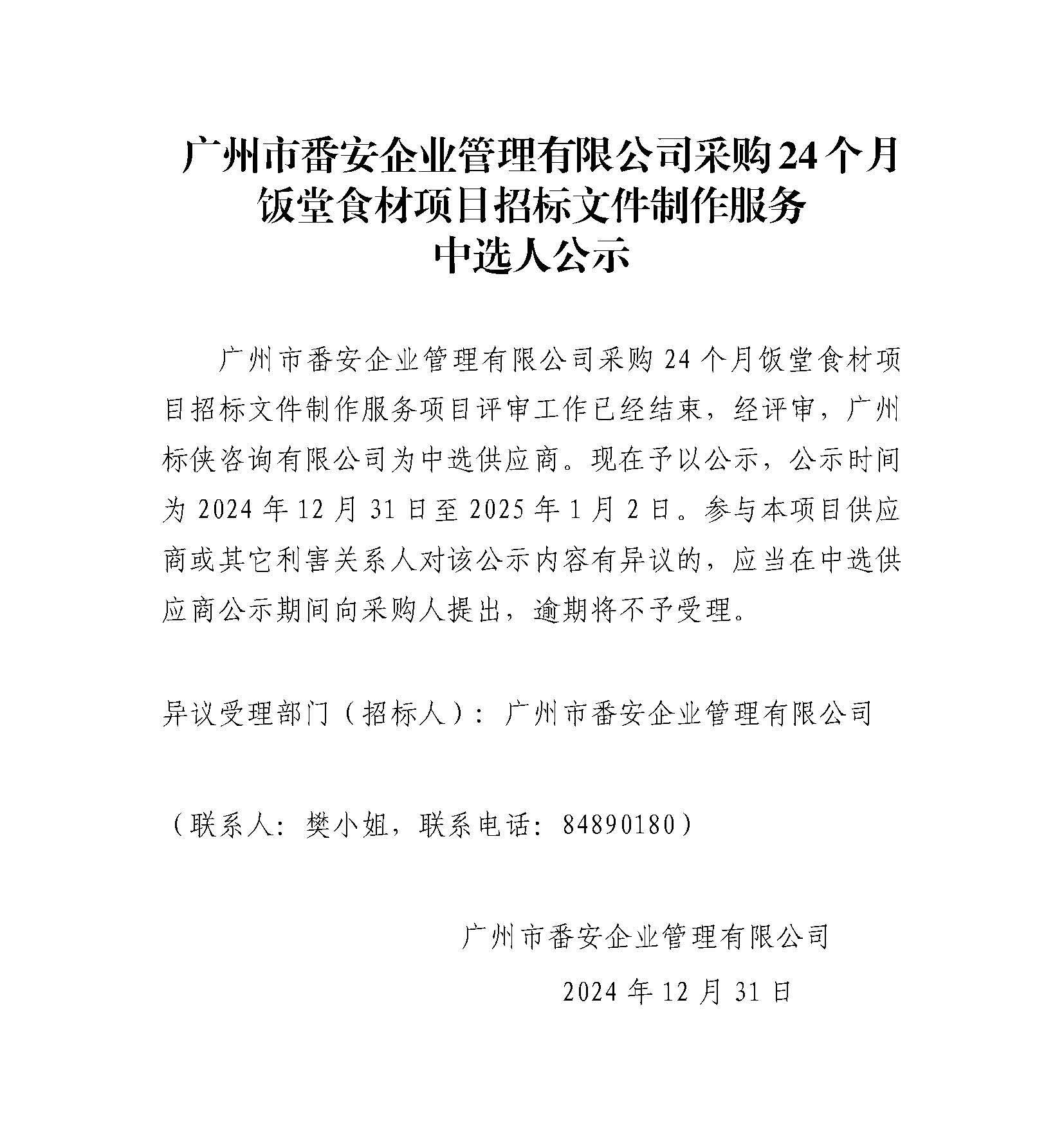 广州市番安企业管理有限公司采购24个月饭堂食材项目招标文件制作服务中选人公示