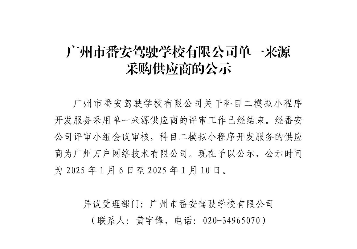 广州市番安驾驶学校有限公司单一来源采购供应商的公示