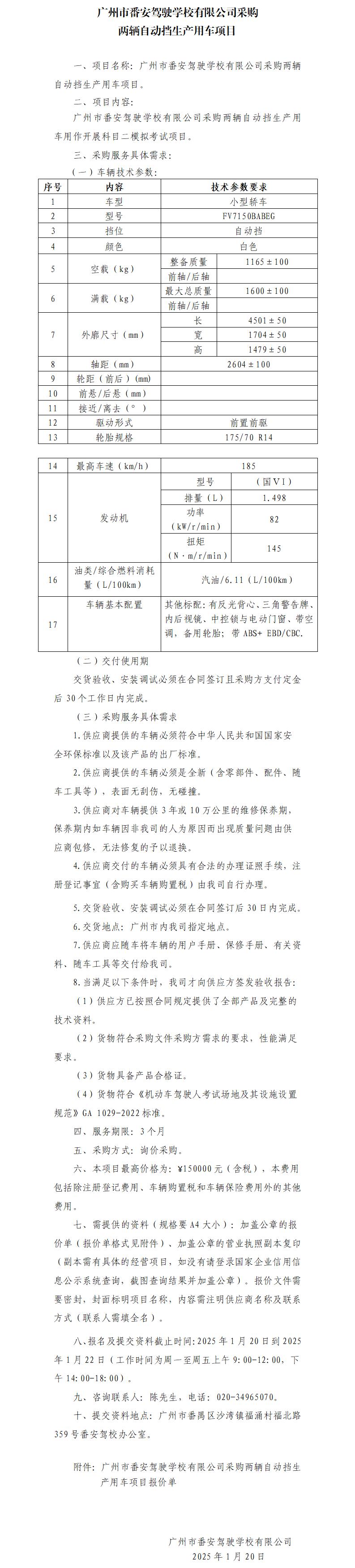 广州市番安驾驶学校有限公司采购两辆自动挡生产用车项目