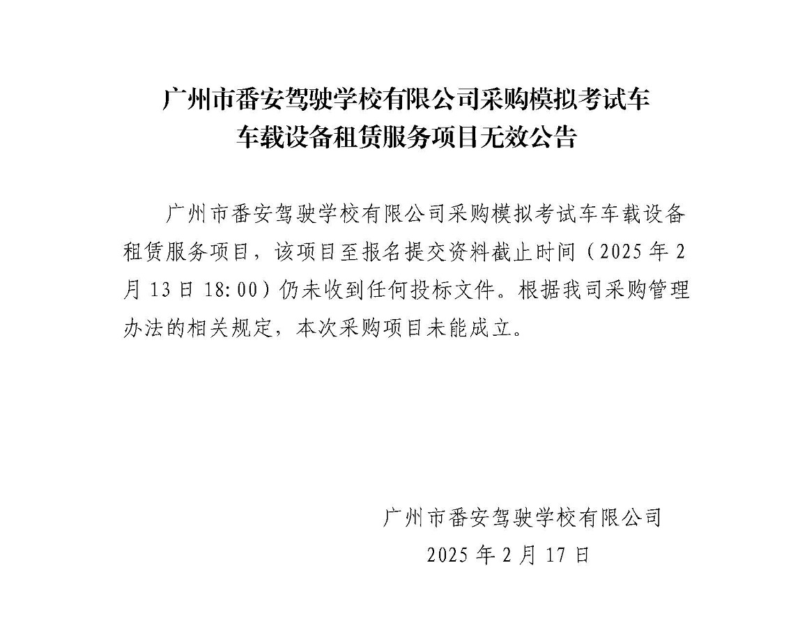 广州市番安驾驶学校有限公司采购模拟考试车车载设备租赁服务项目无效公告