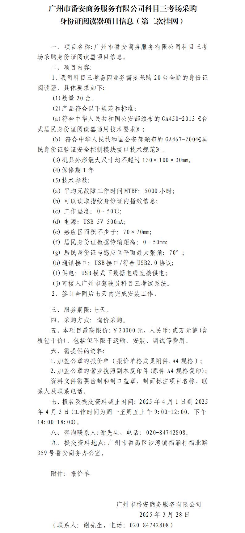 广州市番安商务服务有限公司科目三考场采购身份证阅读器项目信息(第二次挂网)