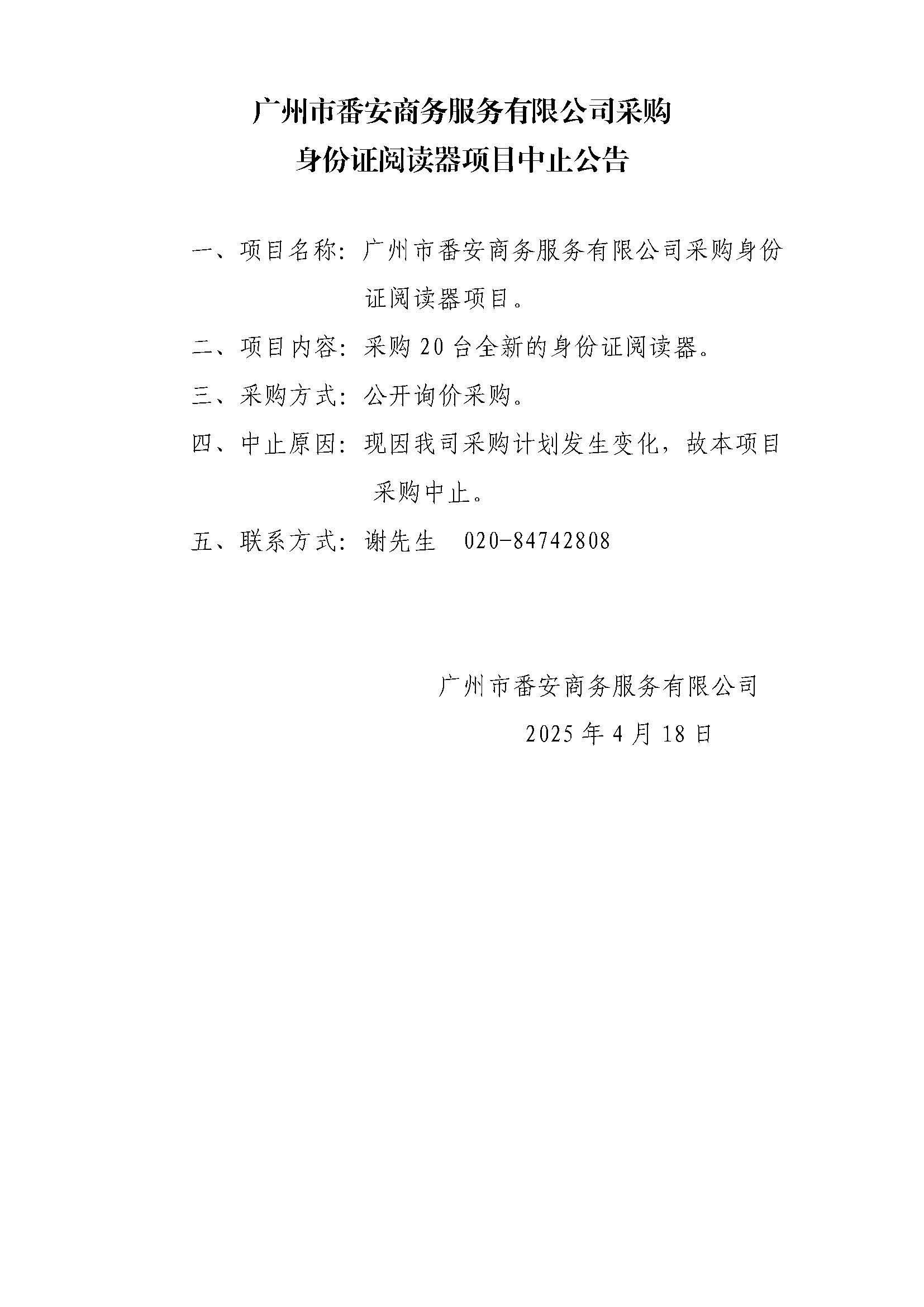 广州市番安商务服务有限公司采购身份证阅读器项目中止公告