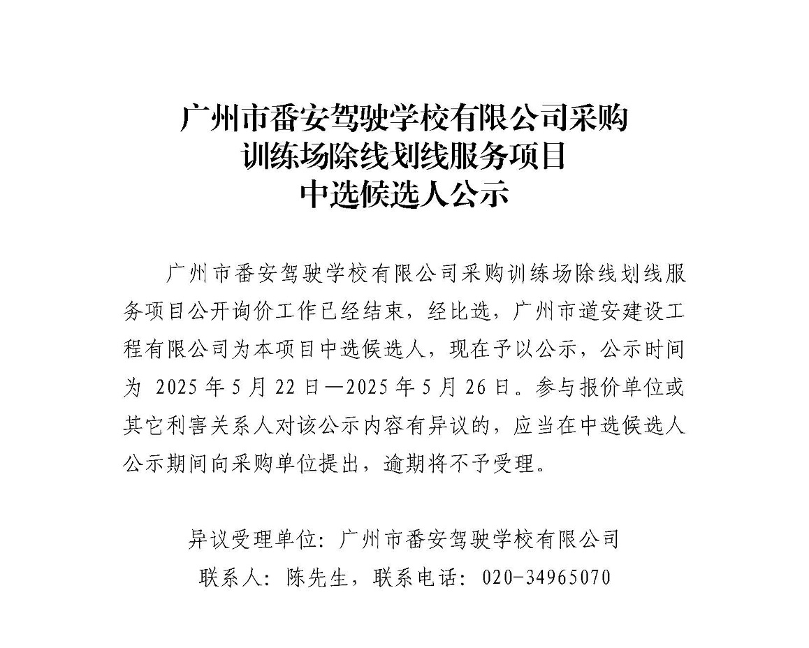 广州市番安驾驶学校有限公司采购训练场除线划线服务项目中选候选人公示