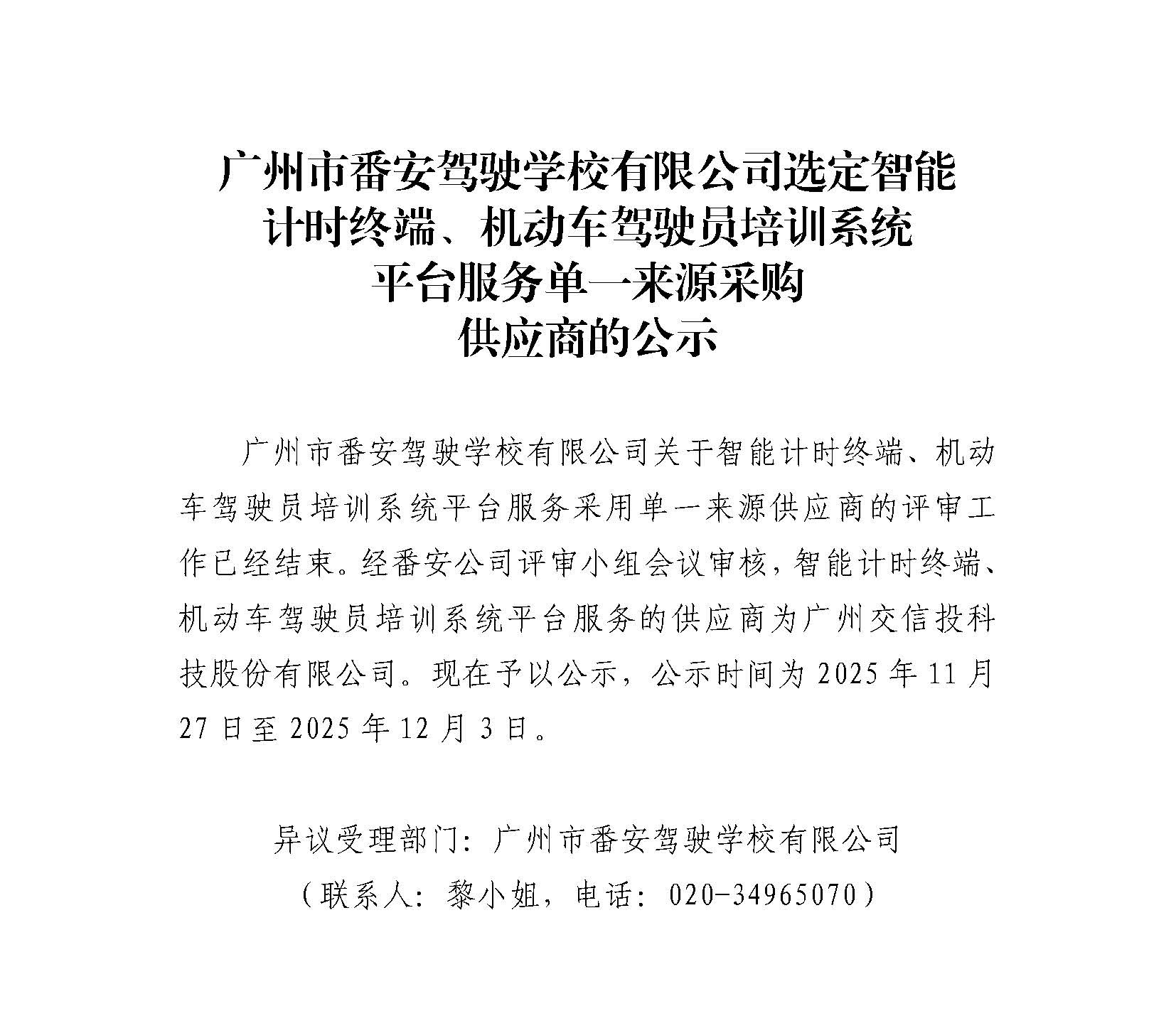 广州市番安驾驶学校有限公司选定智能计时终端、机动车驾驶员培训系统平台服务单一来源采购供应商的公示