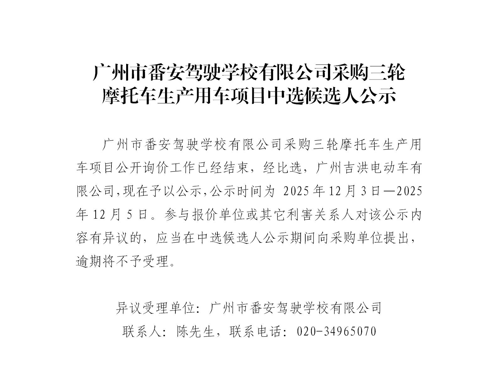 广州市番安驾驶学校有限公司采购三轮摩托车生产用车项目中选候选人公示