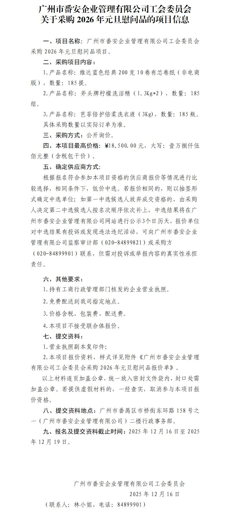 广州市番安企业管理有限公司工会委员会关于采购2026年元旦慰问品项目信息