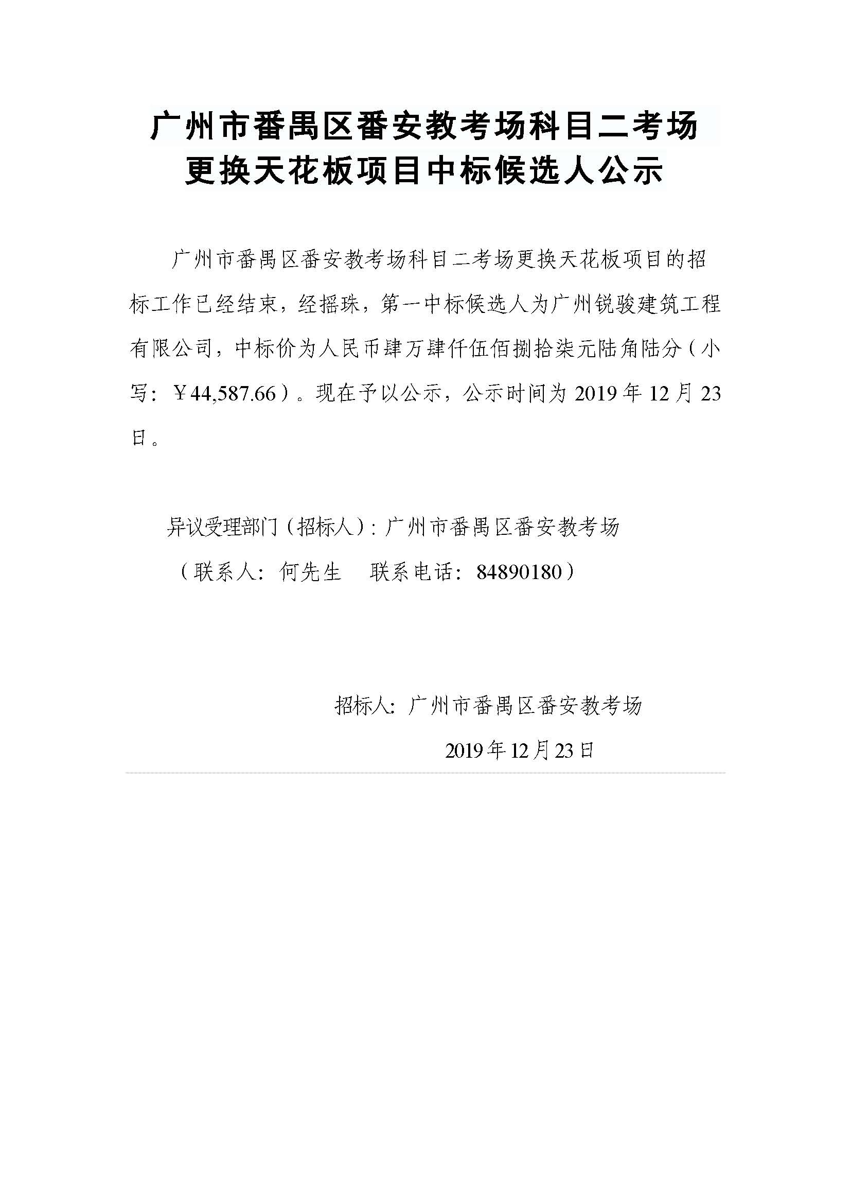 广州市番禺区番安教考场科目二考场更换天花板项目中标候选人公示