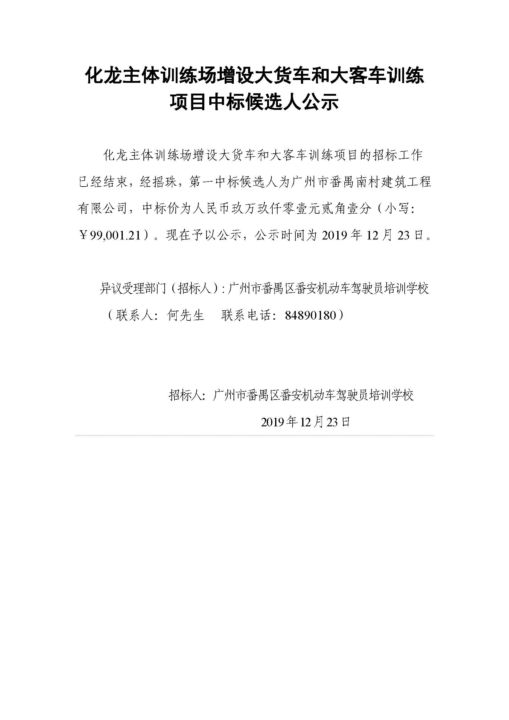 化龙主体训练场增设大货车和大客车训练项目中标候选人公示