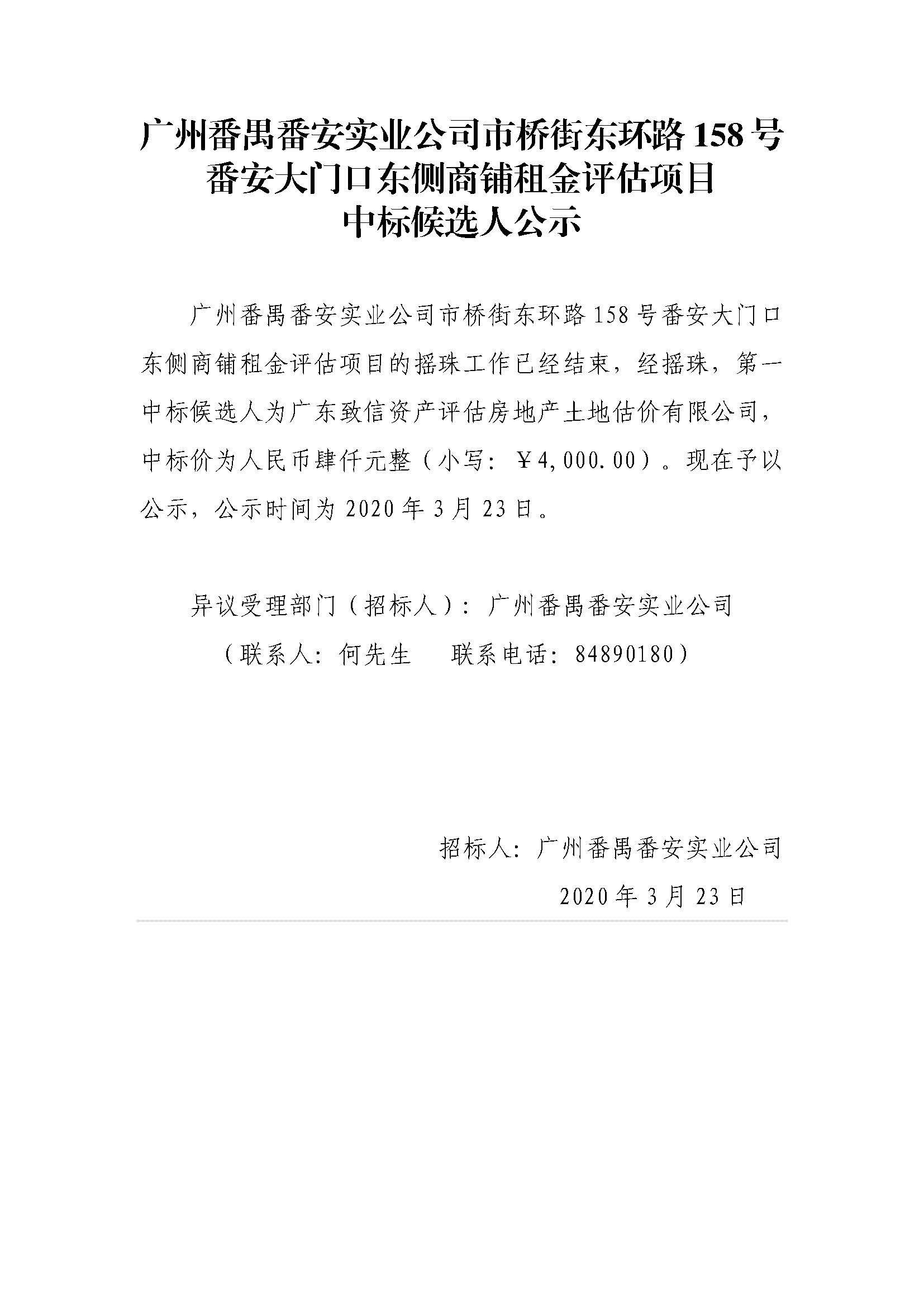 广州番禺番安实业公司市桥街东环路158号番安大门口东侧商铺租金评估项目中标候选人公示
