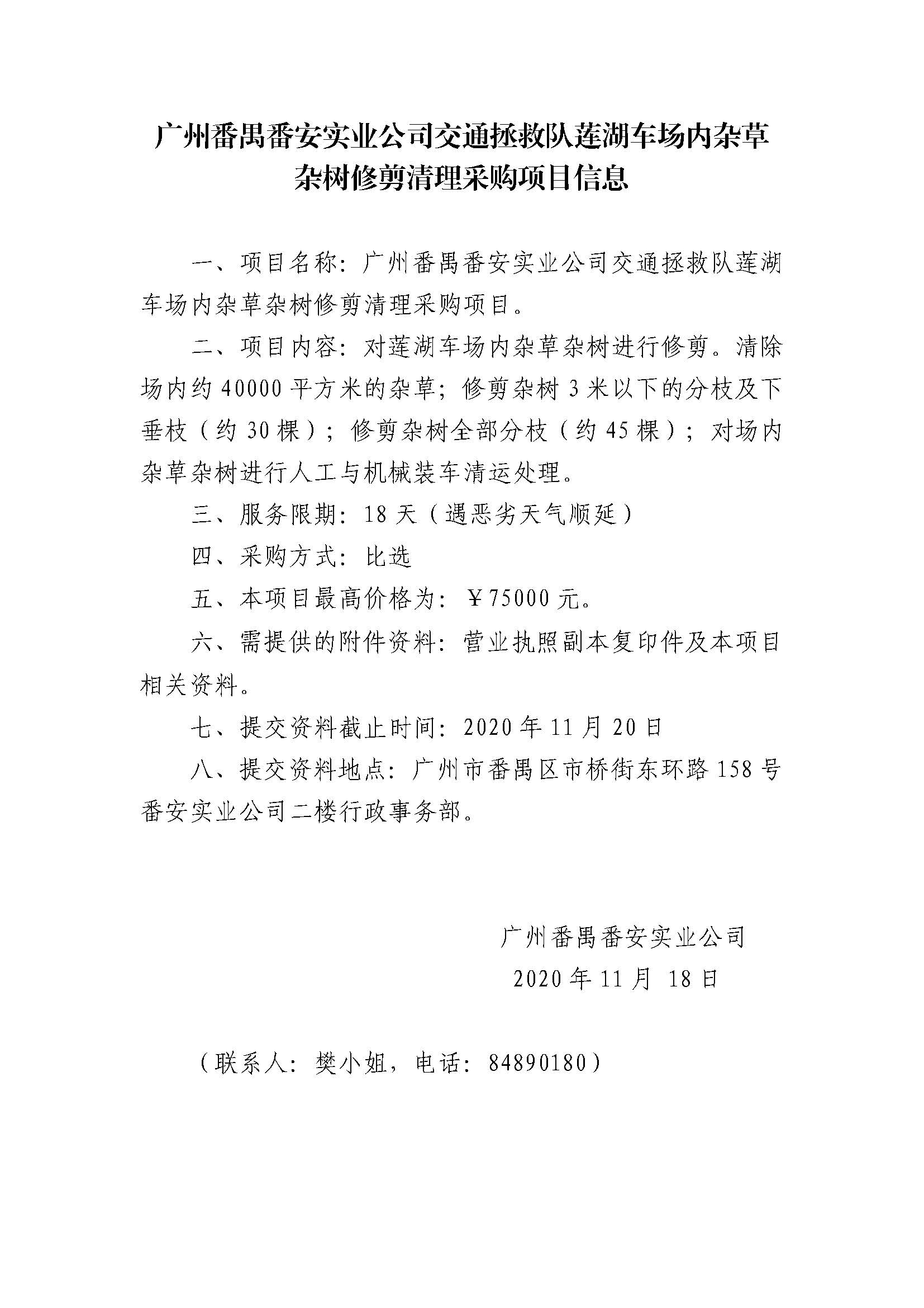 广州番禺番安实业公司交通拯救队莲湖车场内杂草和杂树修剪清理采购项目信息