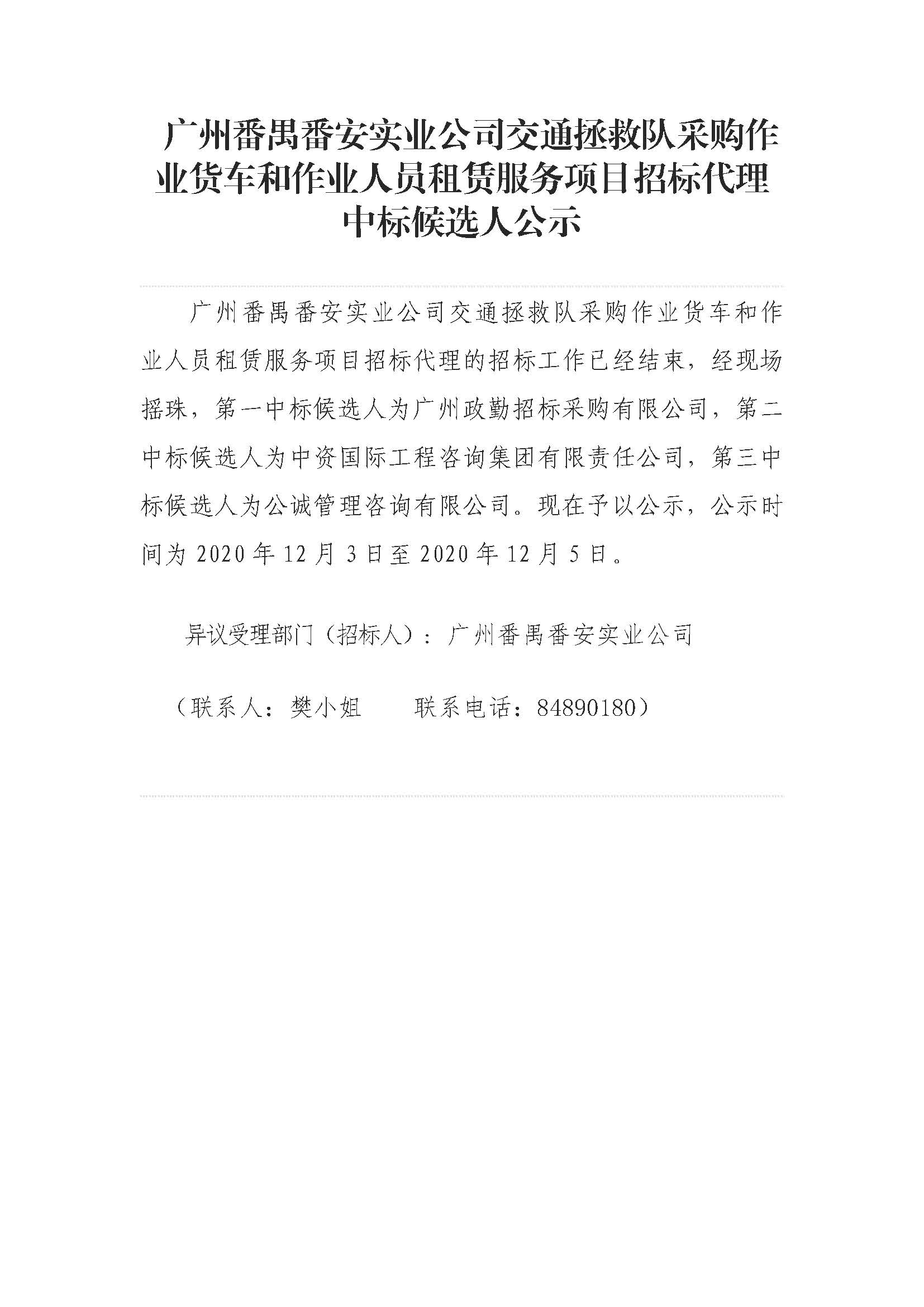 广州番禺番安实业公司交通拯救队采购作业货车和作业人员租赁服务项目招标代理中标候选人公示