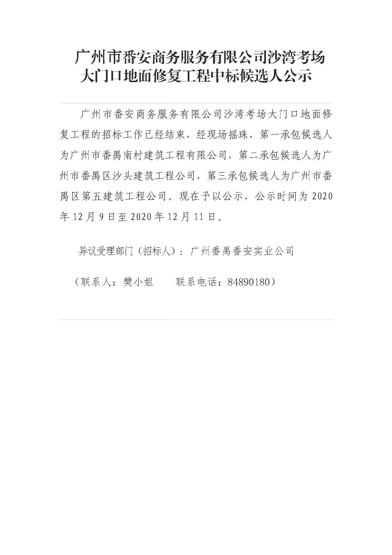 广州市番安商务服务有限公司沙湾考场大门口地面修复工程中标候选人公示