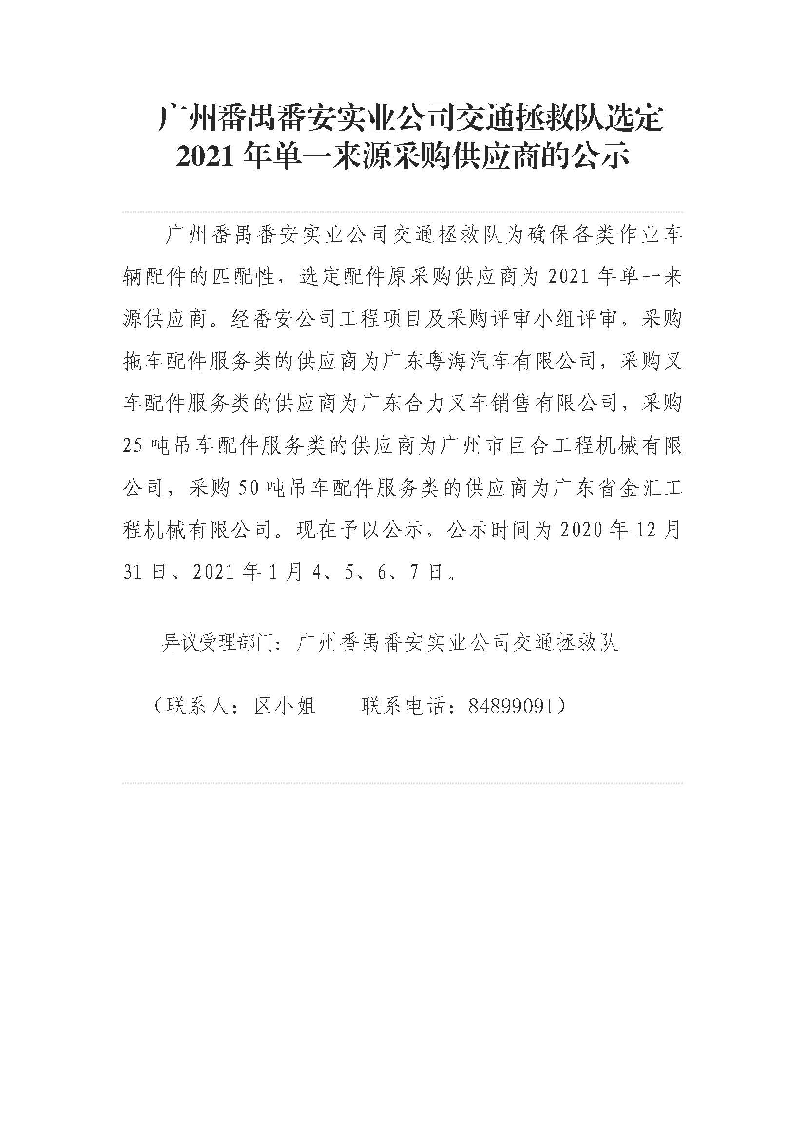 广州番禺番安实业公司交通拯救队选定2021年单一来源采购供应商的公示