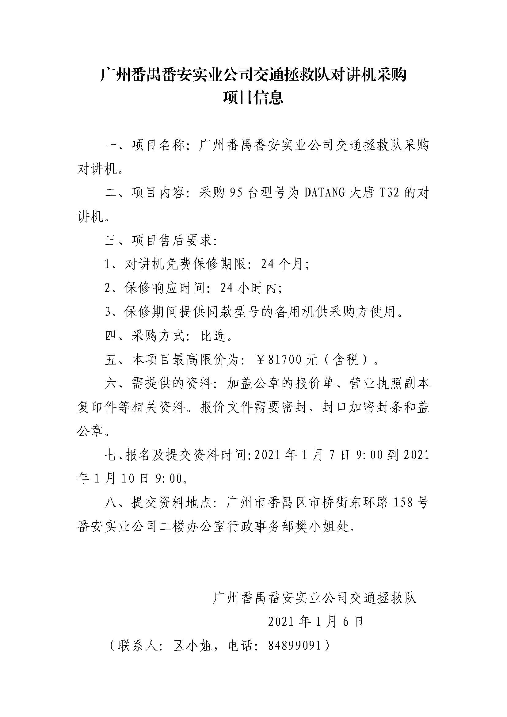 广州番禺番安实业公司交通拯救队对讲机采购项目信息