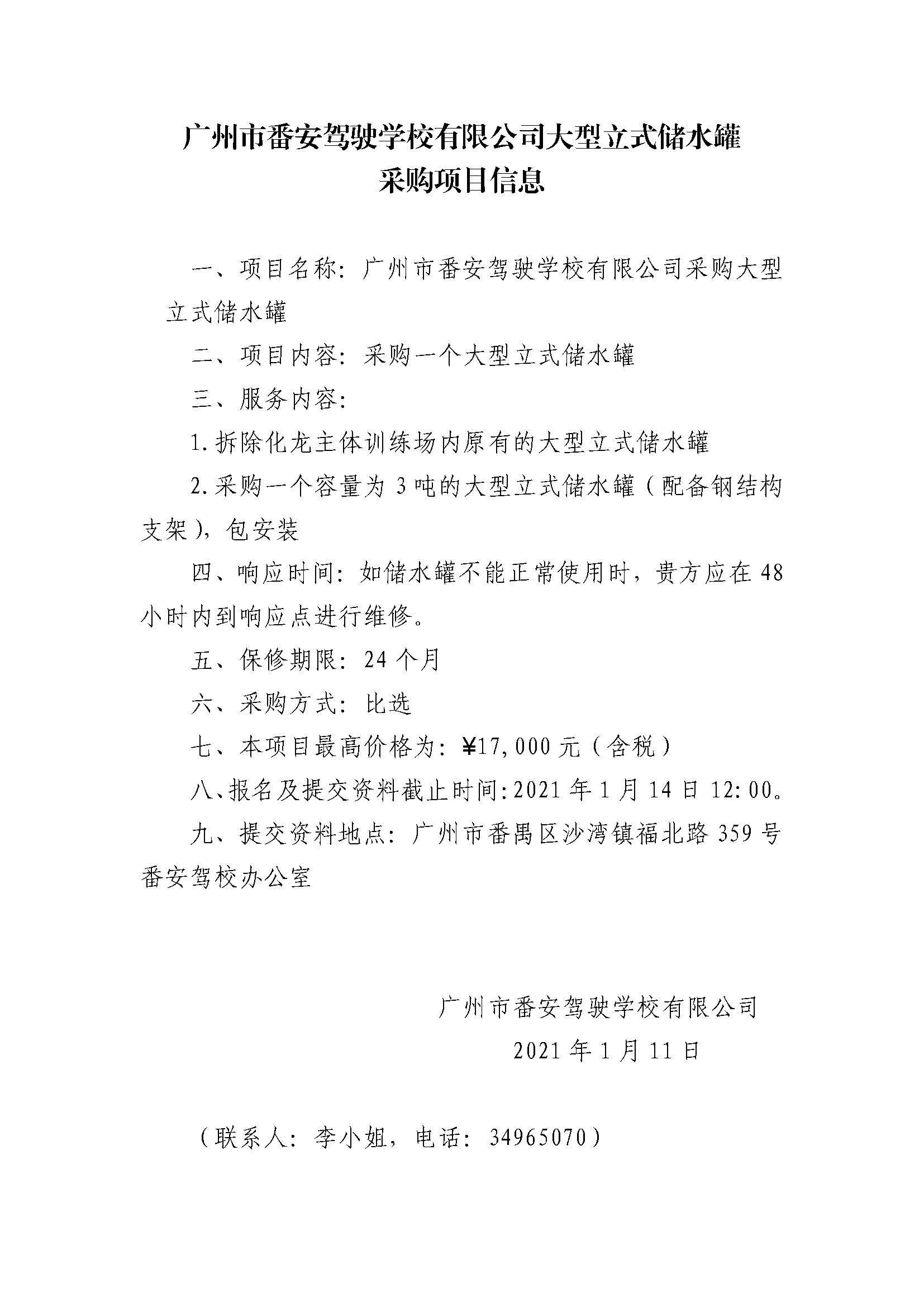 广州市番安驾驶学校有限公司大型立式储水罐采购项目信息
