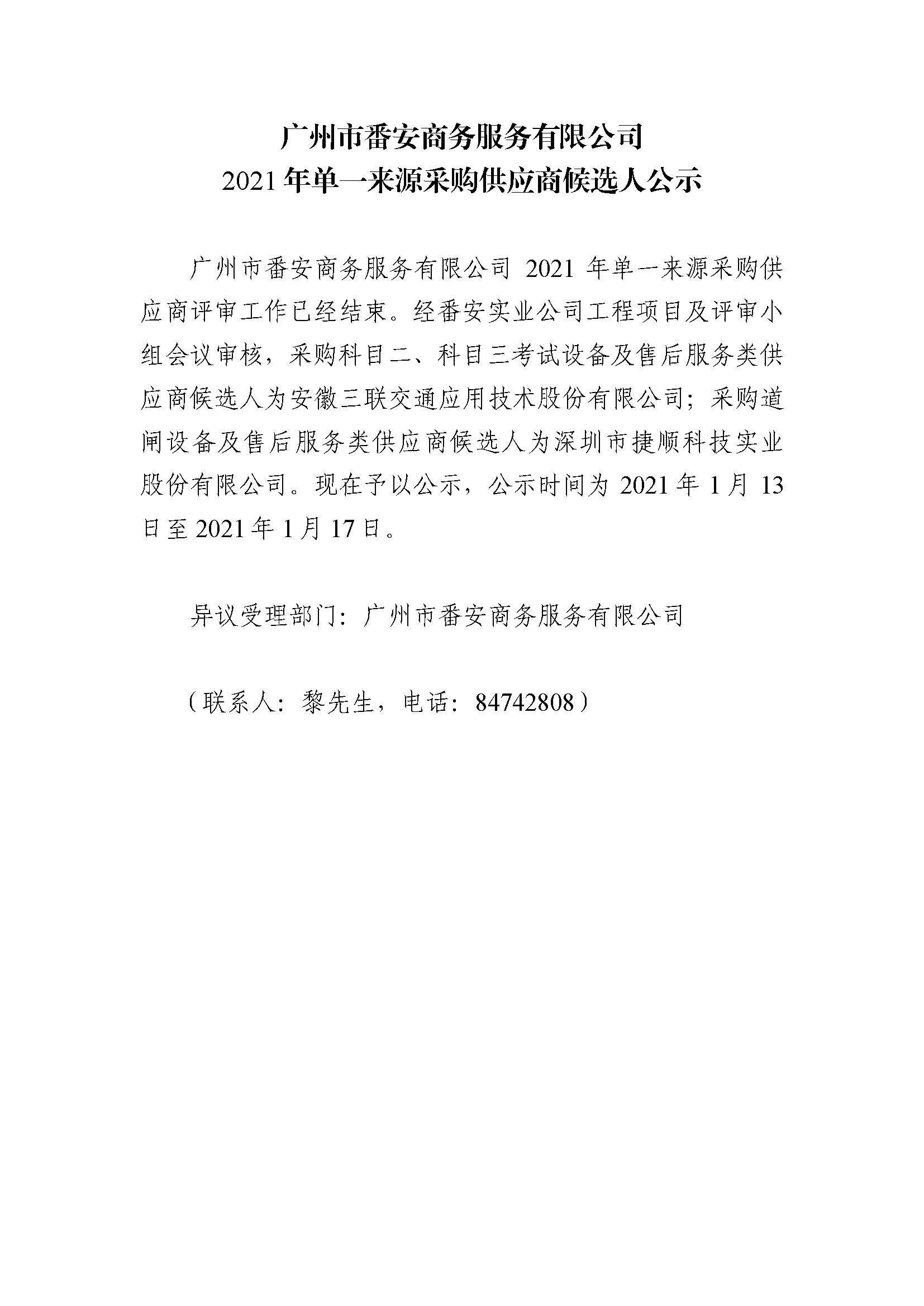 广州市番安商务服务有限公司2021年单一来源采购供应商候选人公示