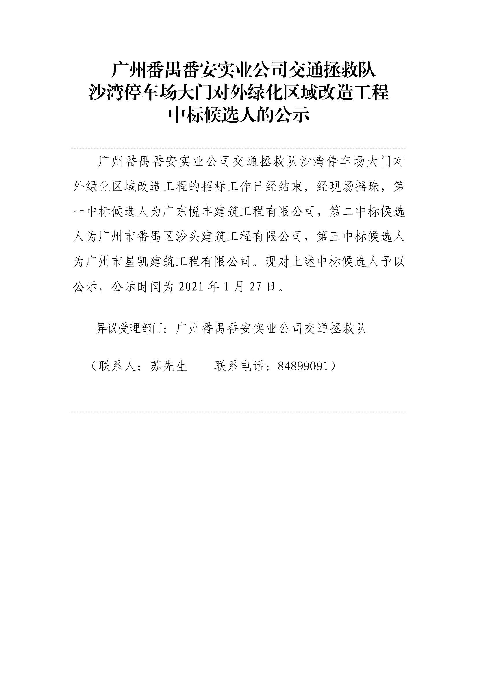 广州番禺番安实业公司交通拯救队关于确定沙湾停车场大门对外绿化区域改造工程中标候选人的公示