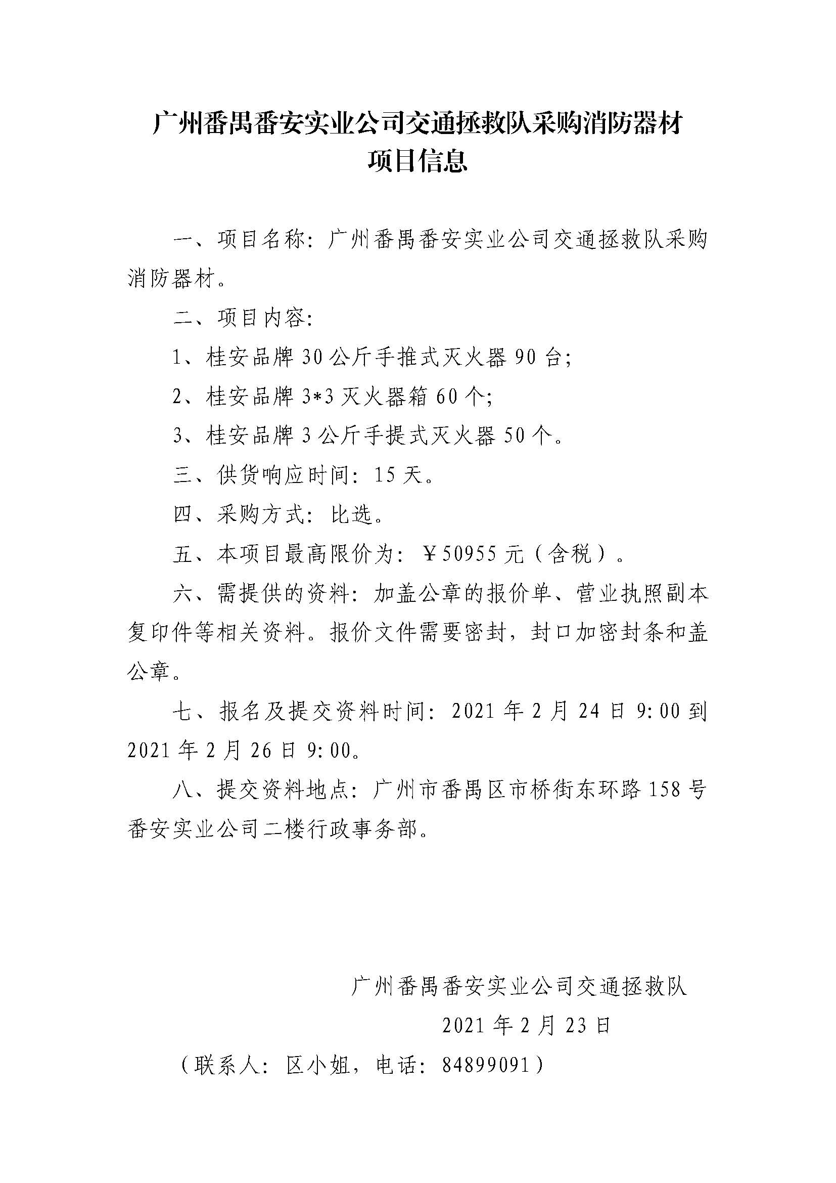 广州番禺番安实业公司交通拯救队采购消防器材项目信息