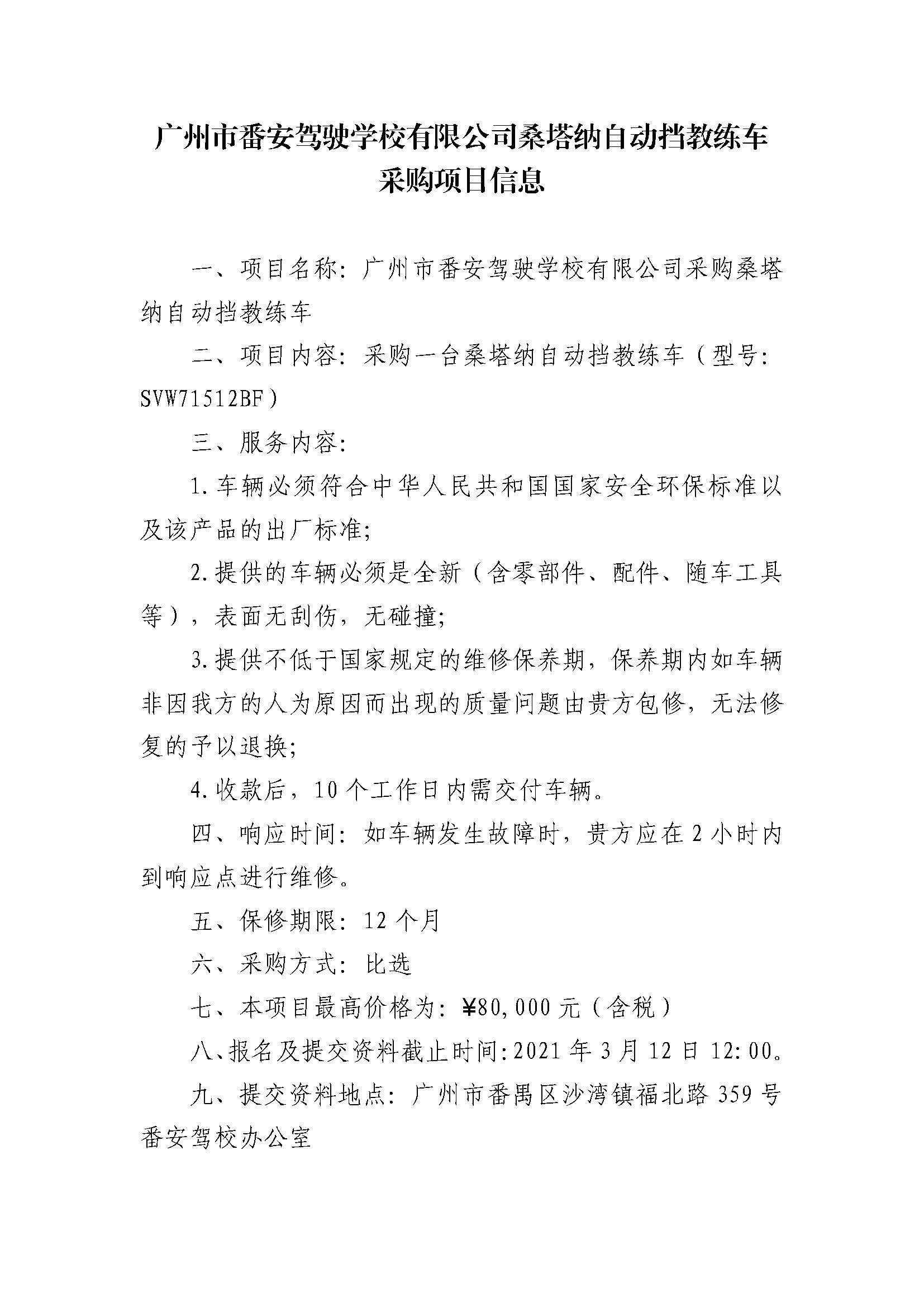 广州市番安驾驶学校有限公司桑塔纳自动挡教练车采购项目信息
