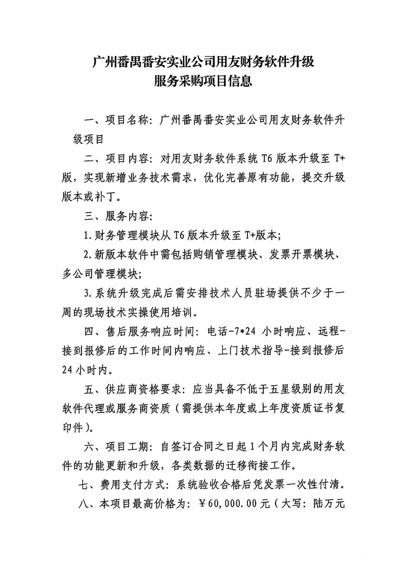 广州番禺番安实业公司用友财务软件升级服务采购项目信息