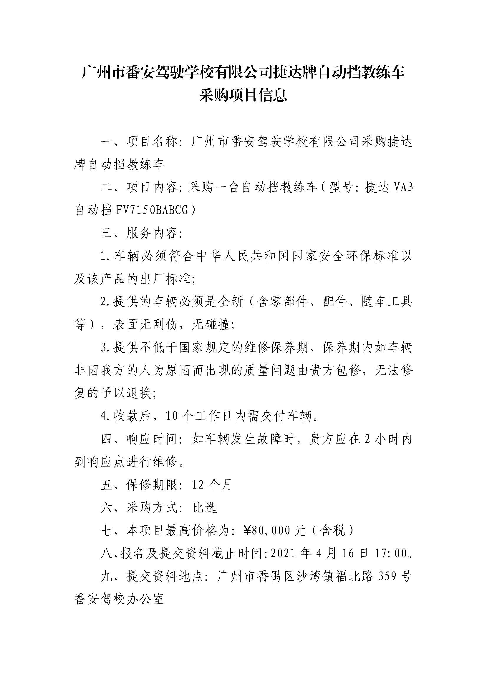 广州市番安驾驶学校有限公司捷达牌自动挡教练车采购项目信息