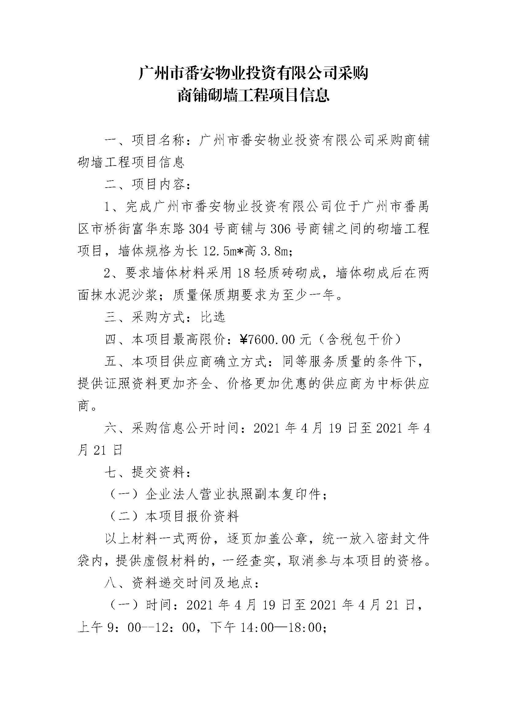 广州市番安物业投资有限公司采购商铺砌墙工程项目信息
