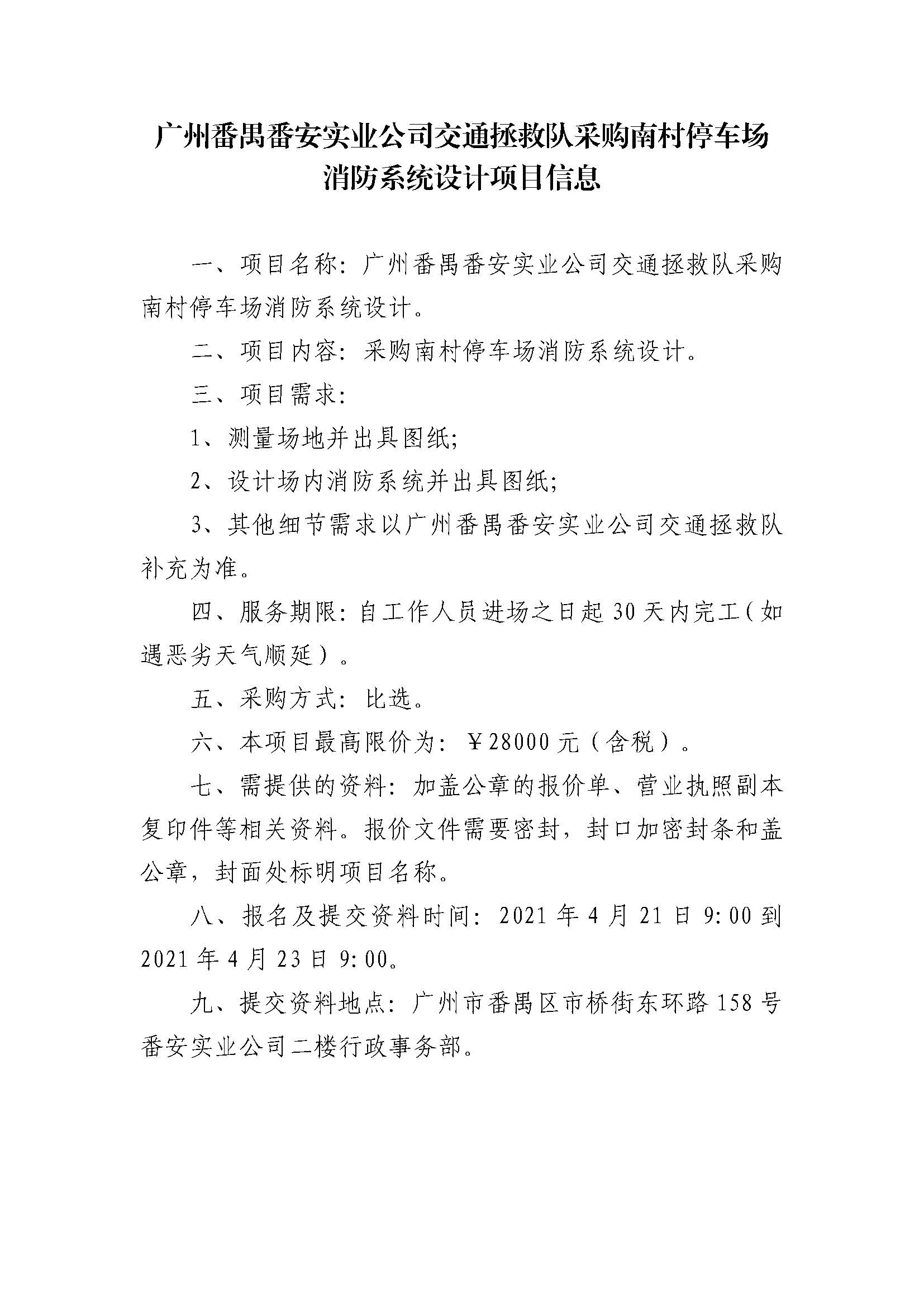 广州番禺番安实业公司交通拯救队采购南村停车场消防系统设计项目信息
