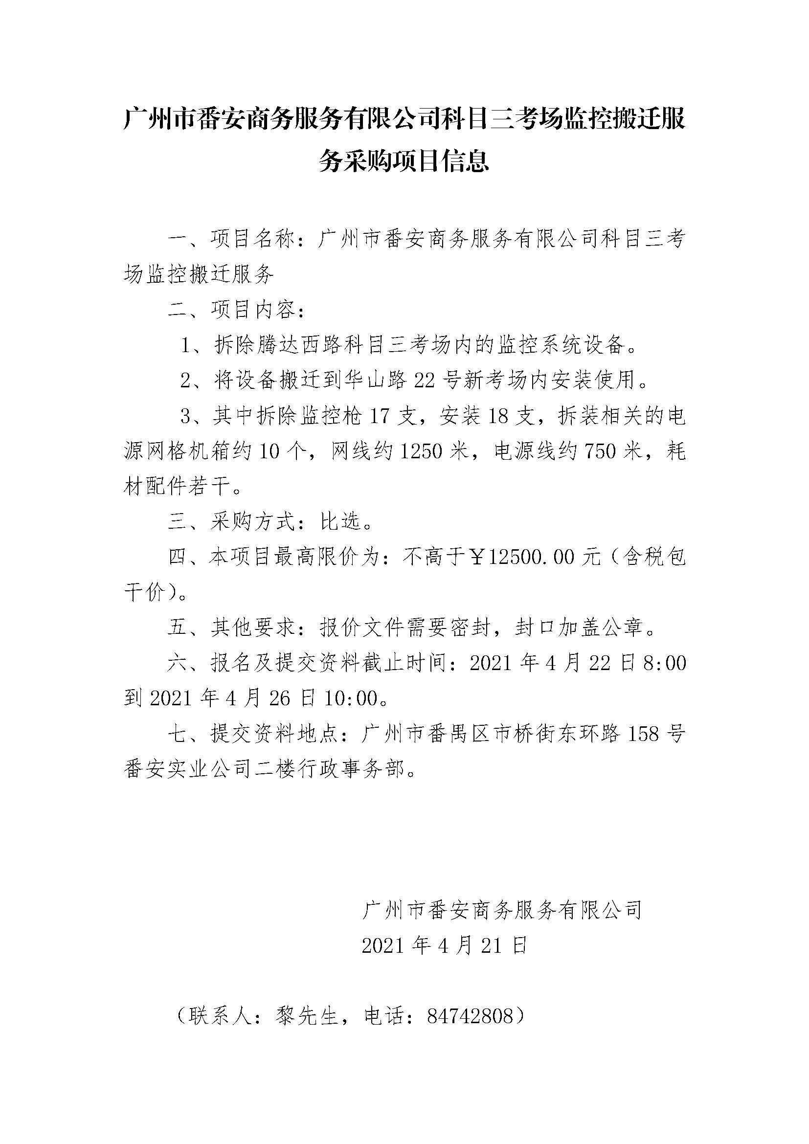 广州市番安商务服务有限公司科目三考场监控搬迁服务采购项目信息