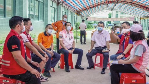 多嘱咐前慰问,抗击疫情有温暖。面对全员核酸检测任务,“尖刀班”成员白天黑夜连轴十来个小时,对前来的居民耐心指导,认真指引,确保居民有序快速进行核酸检测。番禺区区委区政府、番发集团公司班子成员等深知“战役”艰辛、理解一线劳苦。6月5日下午,区纪委副书记、区监委副主任朱呈祥,番禺区石基镇党委书记方宝城前往石基镇前锋村核酸检测点了解工作情况并慰问现场工作人员;广州市番禺区番发集团有限公司党委书记、董事长、总经理李仲民,广州番禺番安实业公司党支部书记、董事、总经理,广州番禺番安实业公司支部委员、董事、工会主席任文东等对公司支援点进行走访慰问,为支援一线的职工送去公司的关怀与温暖。