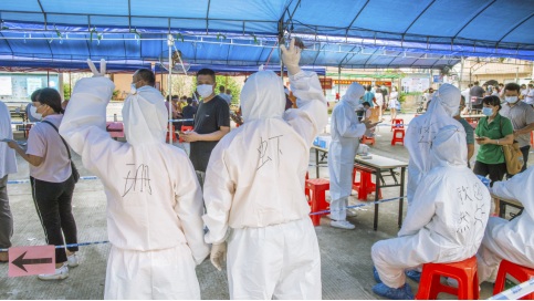 石碁长坦和前锋村老年人居多,很多人没有智能手机,不会扫码登记。队员们及时进行调整部署,把扫码区和排队区拉开距离,用自己的手机为老人们扫码登记,并自觉分为几组,一边进行登记工作,一边为老人们讲解防控措施,耐心安抚老人们的情绪,提高了检测效率。“从排队到采样完毕,整个过程很顺利,很快就做完了。”一位刚做完检测的居民说。