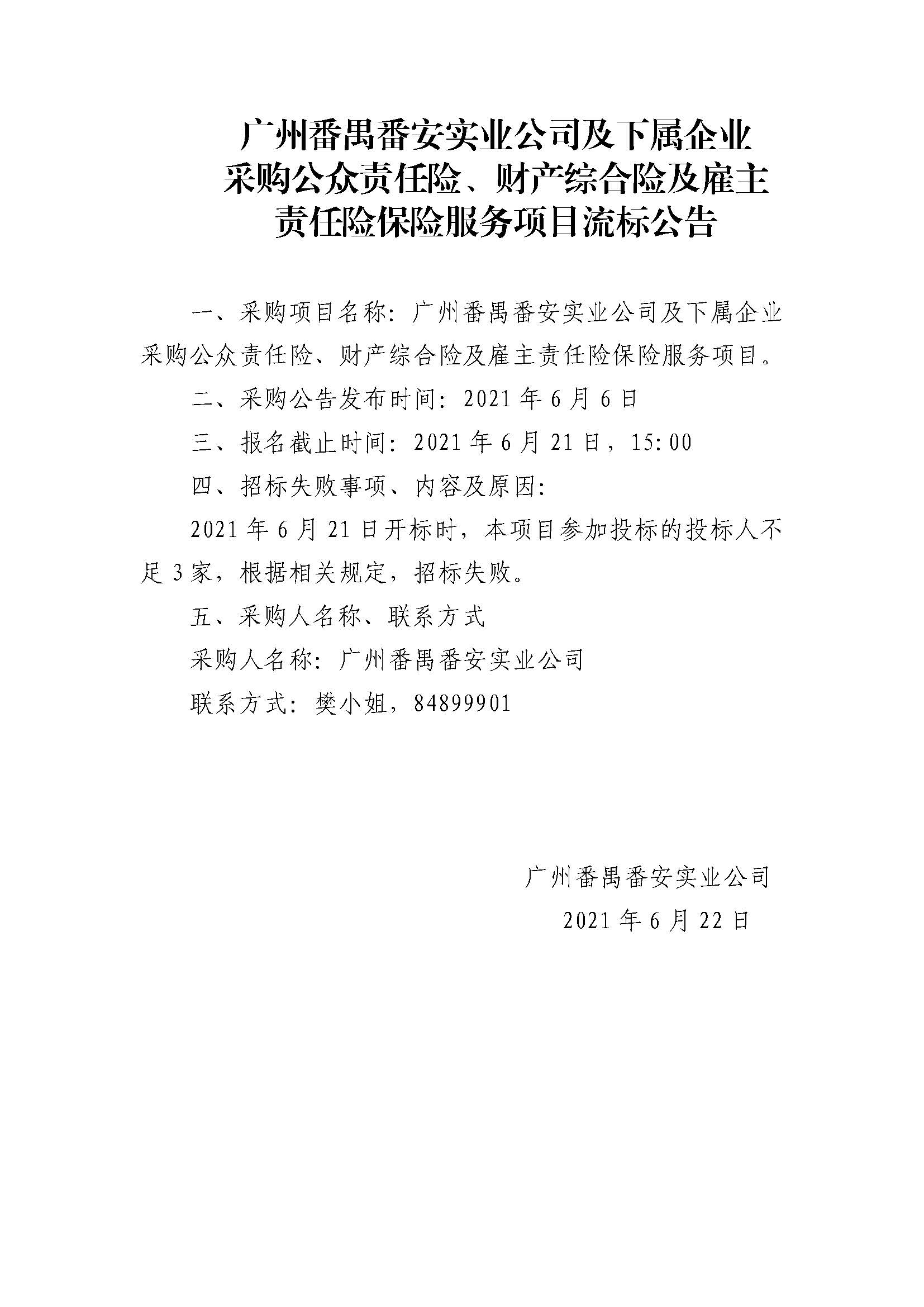 广州番禺番安实业公司及下属企业采购公众责任险、财产综合险及雇主责任险保险服务项目流标公告