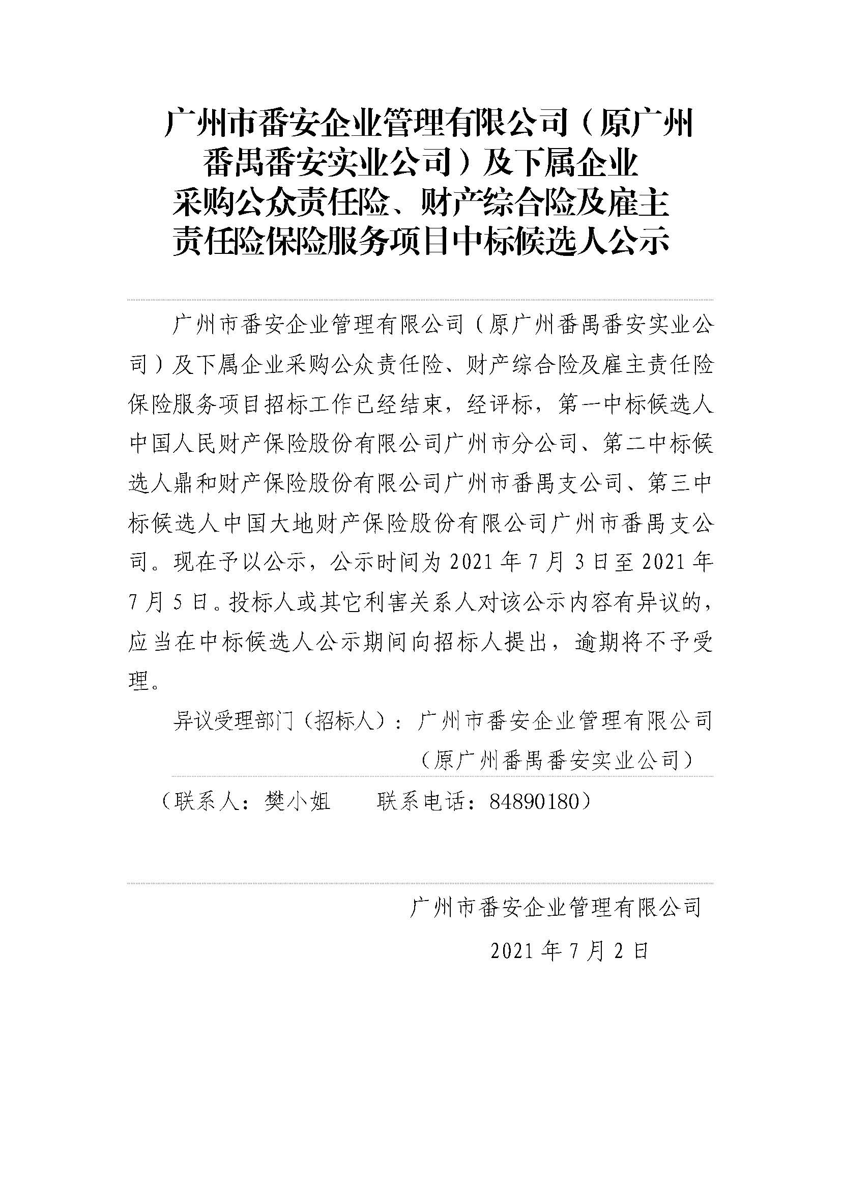 广州市番安企业管理有限公司(原广州番禺番安实业公司)及下属企业采购公众责任险、财产综合险及雇主责任险保险服务项目中标候选人公示