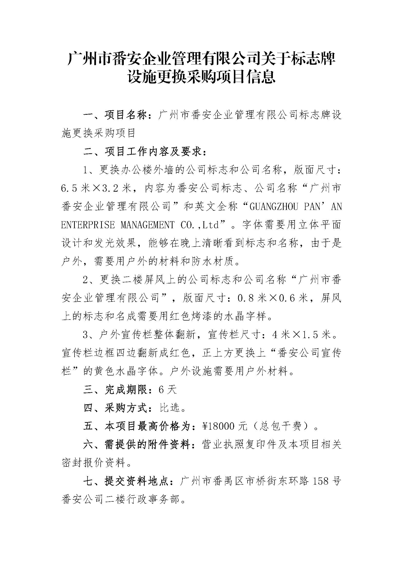 广州市番安企业管理有限公司关于标志牌设施更换采购项目信息