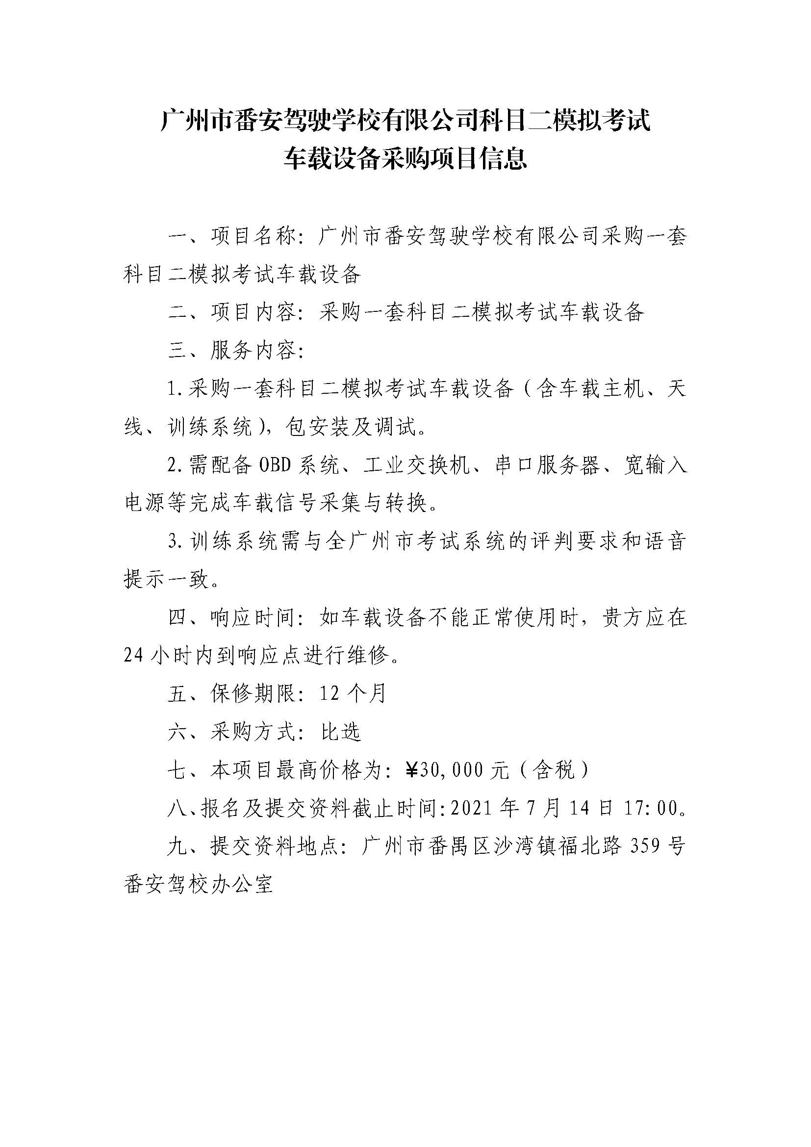 广州市番安驾驶学校有限公司科目二模拟考试车载设备采购项目信息