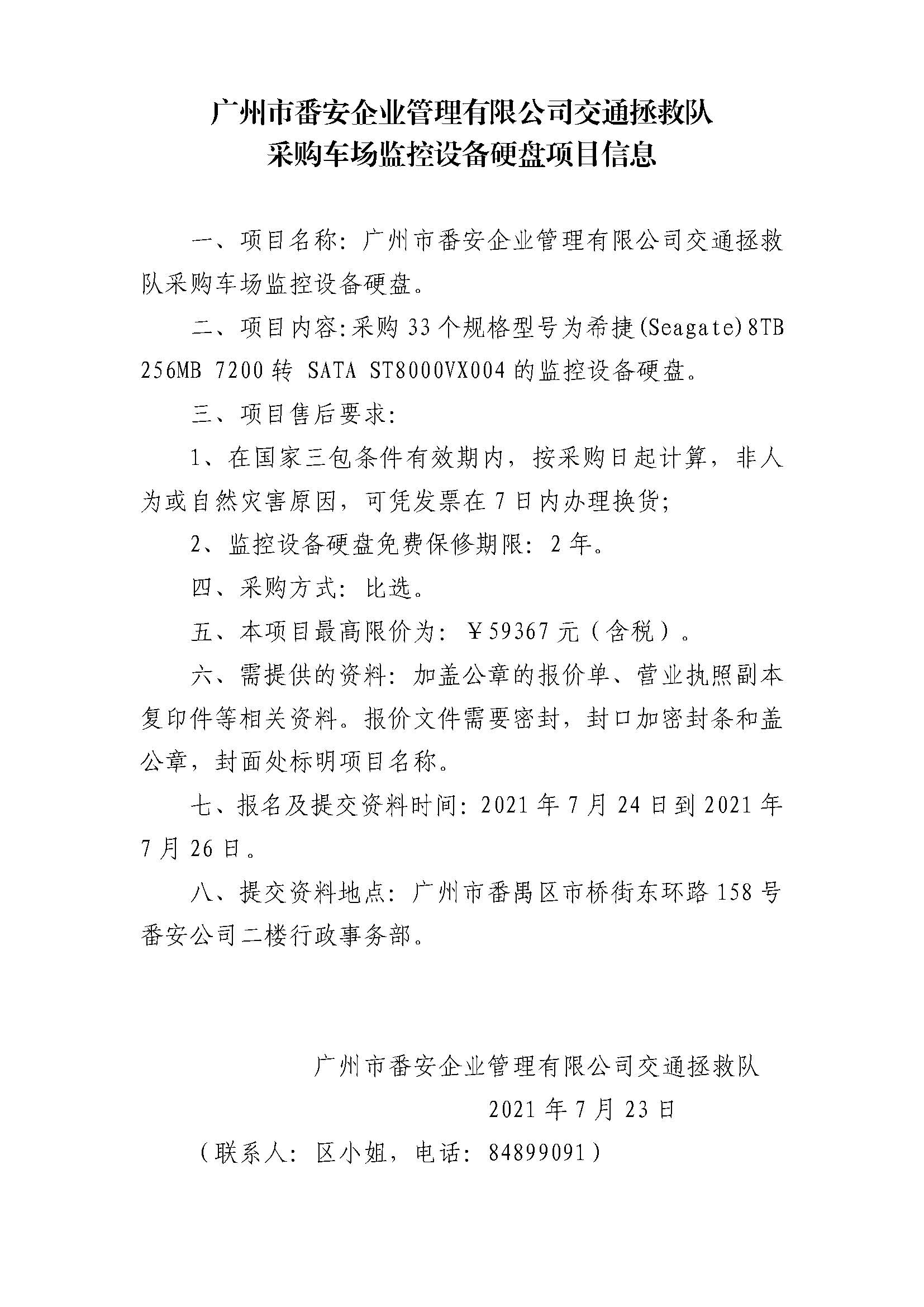 广州市番安企业管理有限公司交通拯救队采购车场监控设备硬盘项目信息