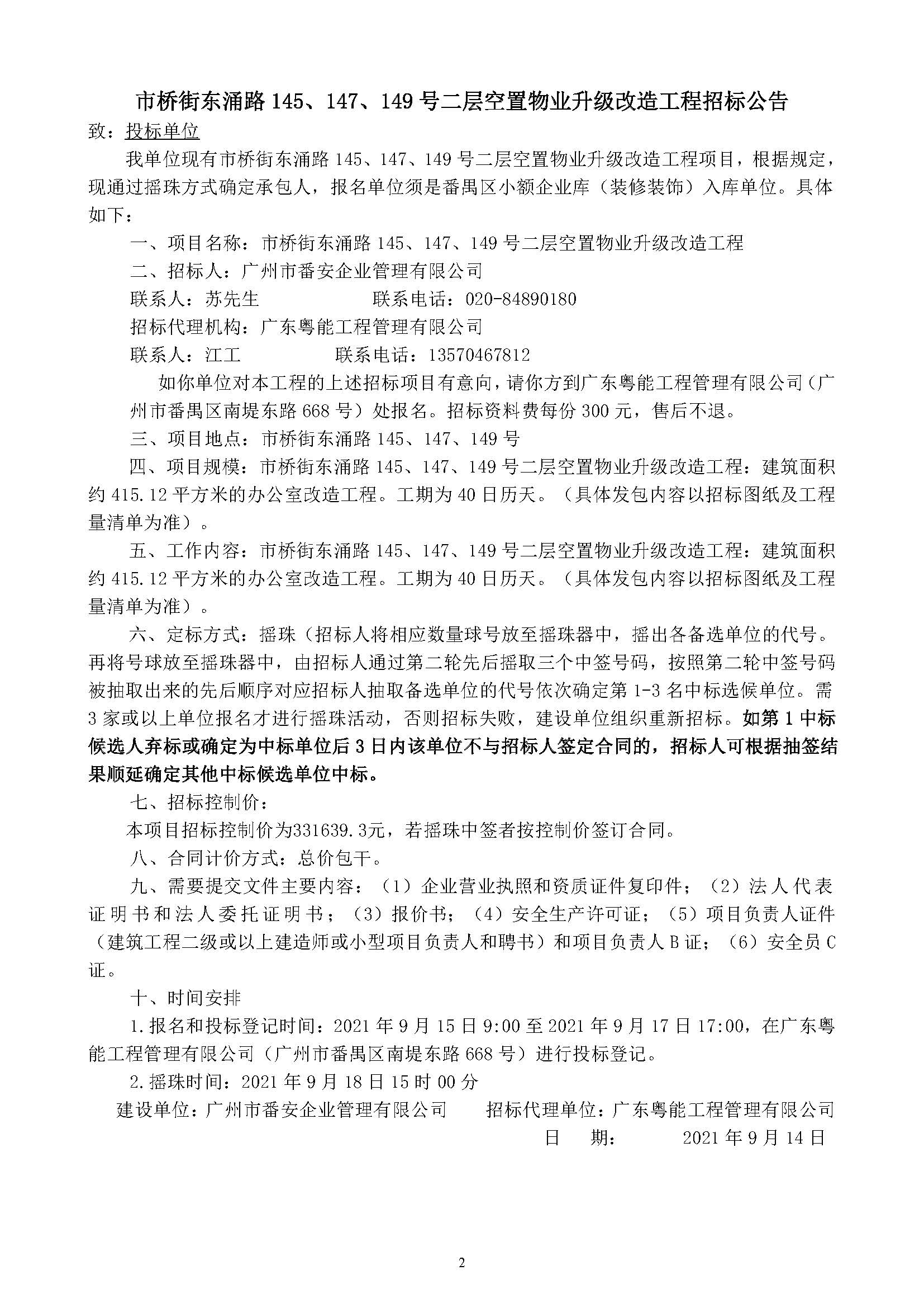 市桥街东涌路145、147、149号二层空置物业升级改造工程招标书