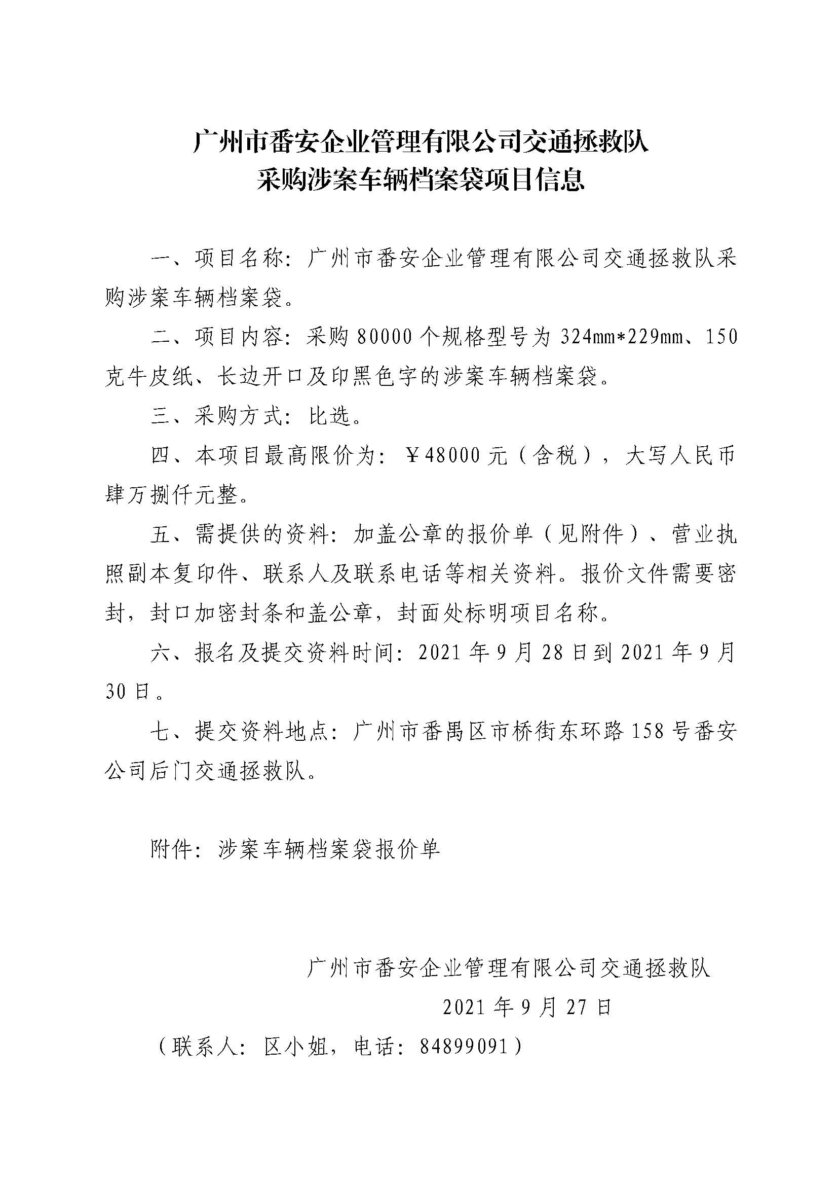 广州市番安企业管理有限公司交通拯救队采购涉案车辆档案袋项目信息